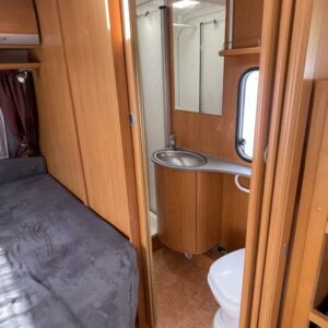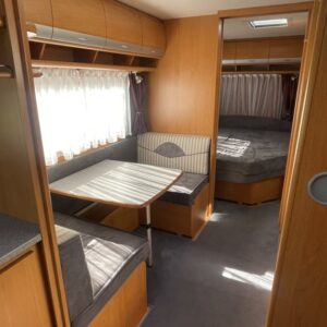 Pohjaratkaisussa takana U- sohvaryhmä sekä keittiö mikrolla ja mikroaaltouunilla. Keskiosassa kerrosvuoteet sekä sohvaryhmä. Etuosassa pitkittäinen parivuode sekä Wc & Suihkutila.