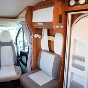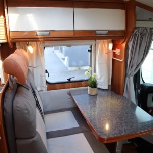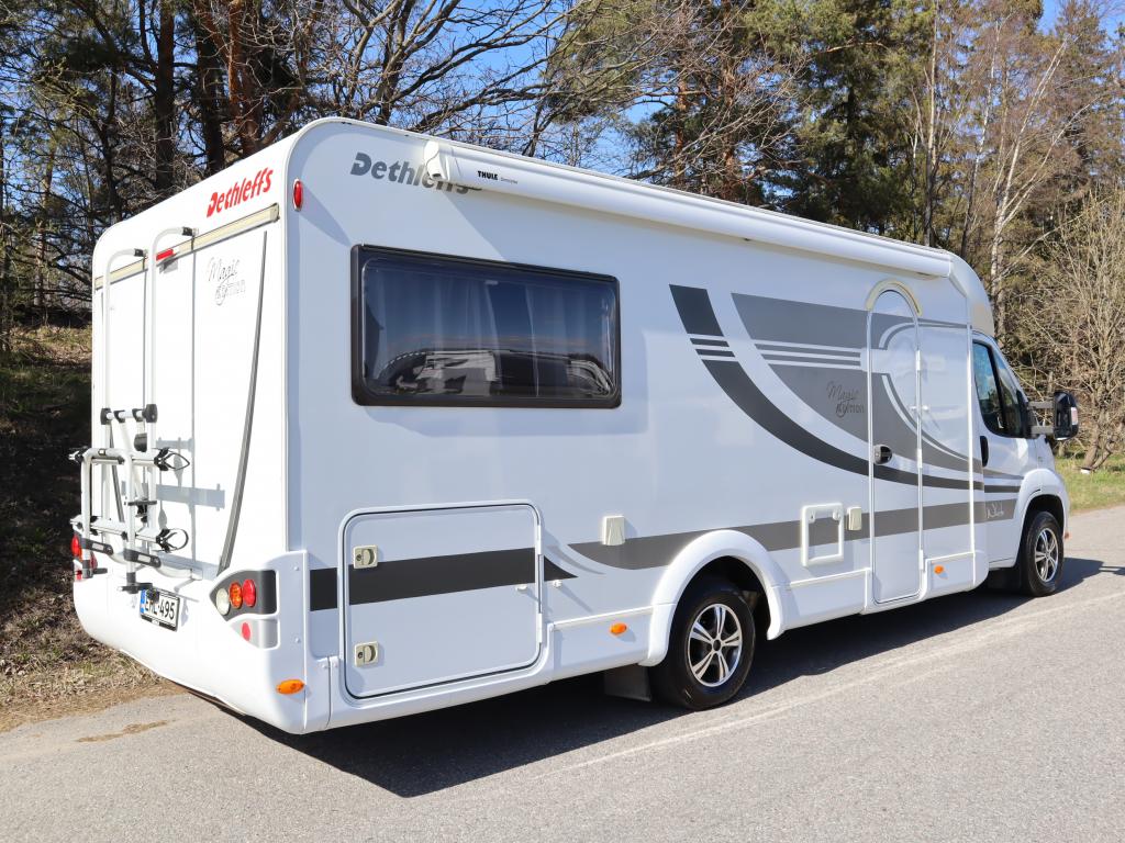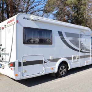Hieno Dethleffs matalilla erillisvuoteilla. Edessä pöytäryhmä sivupenkillä, keskellä keittiö korkealla jääkaapilla, Wc/kylpyhuone yhdistelmä, takana tilavat ja leveät erillisvuoteet.