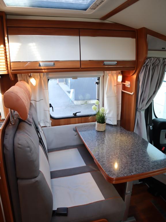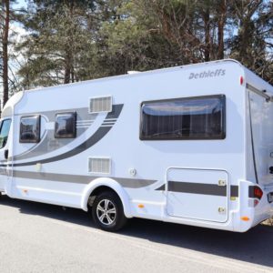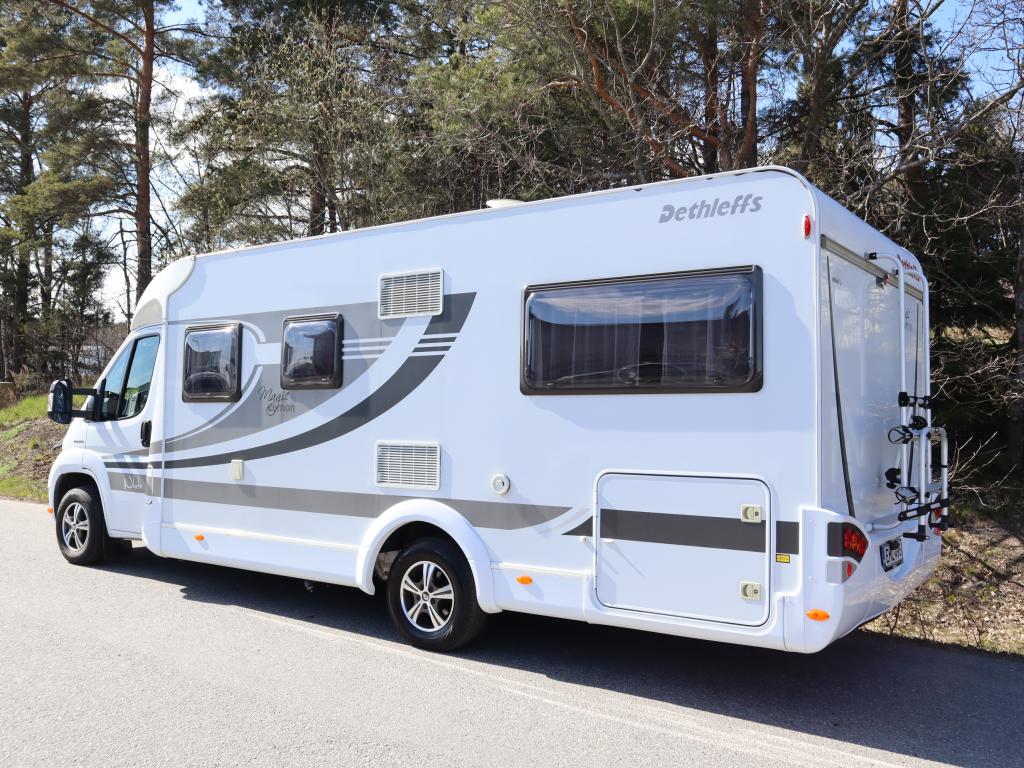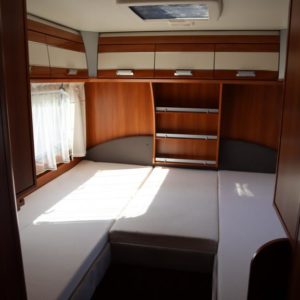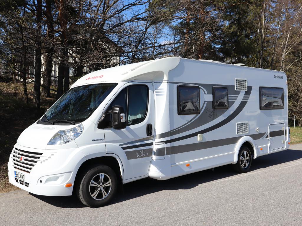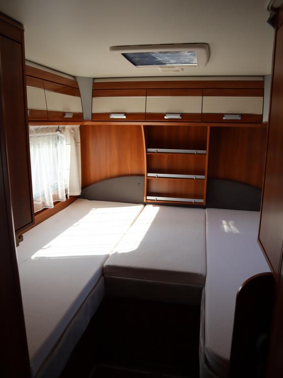 Hieno Dethleffs matalilla erillisvuoteilla. Edessä pöytäryhmä sivupenkillä, keskellä keittiö korkealla jääkaapilla, Wc/kylpyhuone yhdistelmä, takana tilavat ja leveät erillisvuoteet.