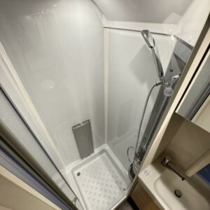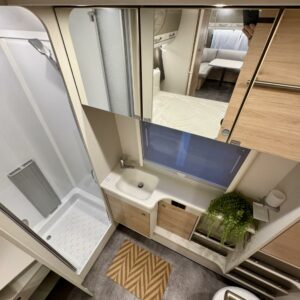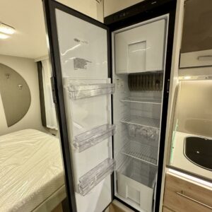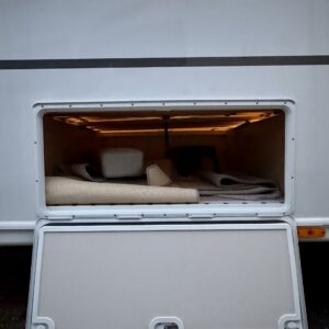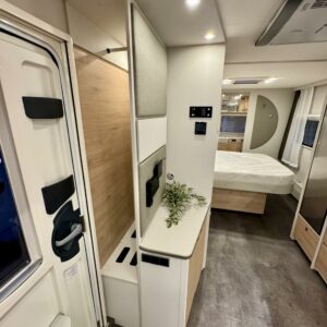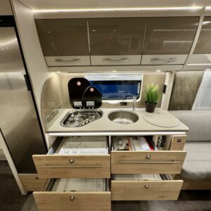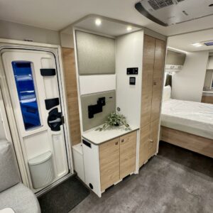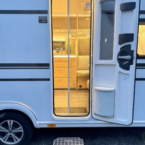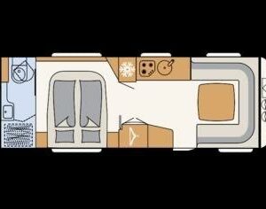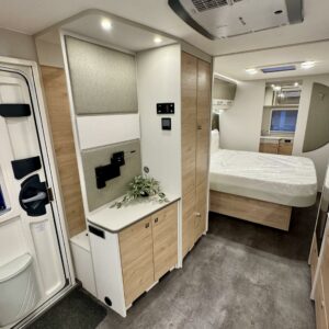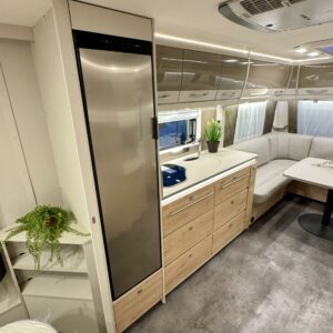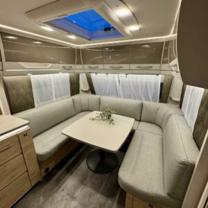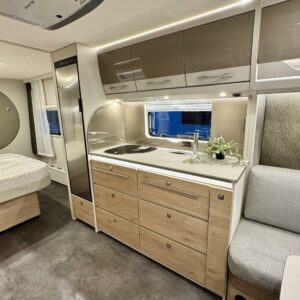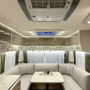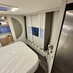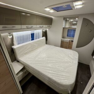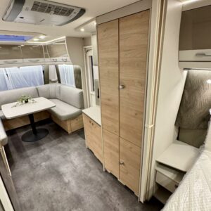 Edessä suuri istuinryhmä joka sijattavissa parivuoteeksi. Keskellä avara keittiö, jossa kivasti laskutilaa, suuri jääkaappipakastin -yhdistelmä ja vastapuolella suuri vaatekaappi sekä ulkovaate kaappi oven vieressä. Taaempana leveä saarekevuode, josta helppo nousta molemmin puolin. Vuoteen alla suuri säilytystila, jonne ulkoluukku. Ulkoluukusta mahtuvat helposti sisään retkipöydät ja sukset.