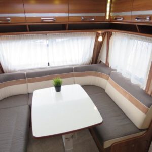 Keulassa tilava U-istuinryhmä, keskellä keittiö sekä wc/ kylpyhuone. Perällä hyvät ja leveät erilliset vuoteet, sänkyjen alla tavaratilaa.