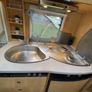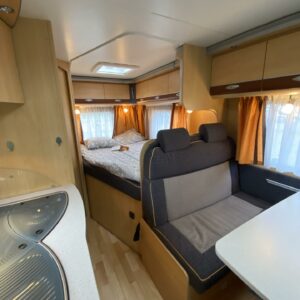 Näpsäkkä vähän reilu 6-metrinen matka-auto tarjoaa matkustuspaikat (vyöt kaikille) kuudelle henkilölle ja nukkumapaikat neljälle henkilölle. Auton takaosaan on sijoitettu pitkittäinen parivuode. Toiselta sivulta löytyy WC ja kylpyhuonetilat. Suihkulle on oma erillinen tilansa. Etuosa on sitten keittiö-olohuonetilaa minkä keskuksena on vastakkain istuttava pöytäryhmä. Pöytäryhmästä saa tarvittaessa sijattua vuoteen kahdelle henkilölle. Lämmitysjärjestelmänä on koleammallakin kelillä tuvan lämpöisenä pitävä Alden nestekeskuslämmitys. Aldelle ominaisesti lämmittimestä löytyy sähkövastukset, sekä lämminvesiboileri. Autoon on valmiiksi asennettu myös vetokoukku, sekä pyöräteline. Koukun vetomassat on jarrulliselle kärrille 1800kg ja jarruttomalle 750kg.