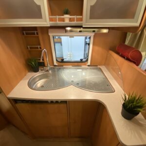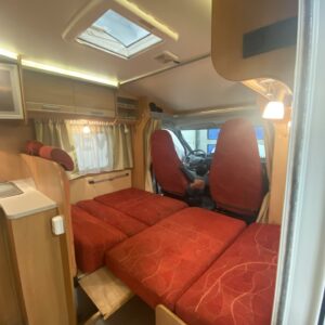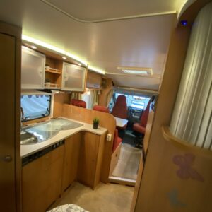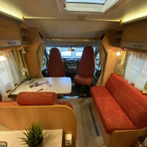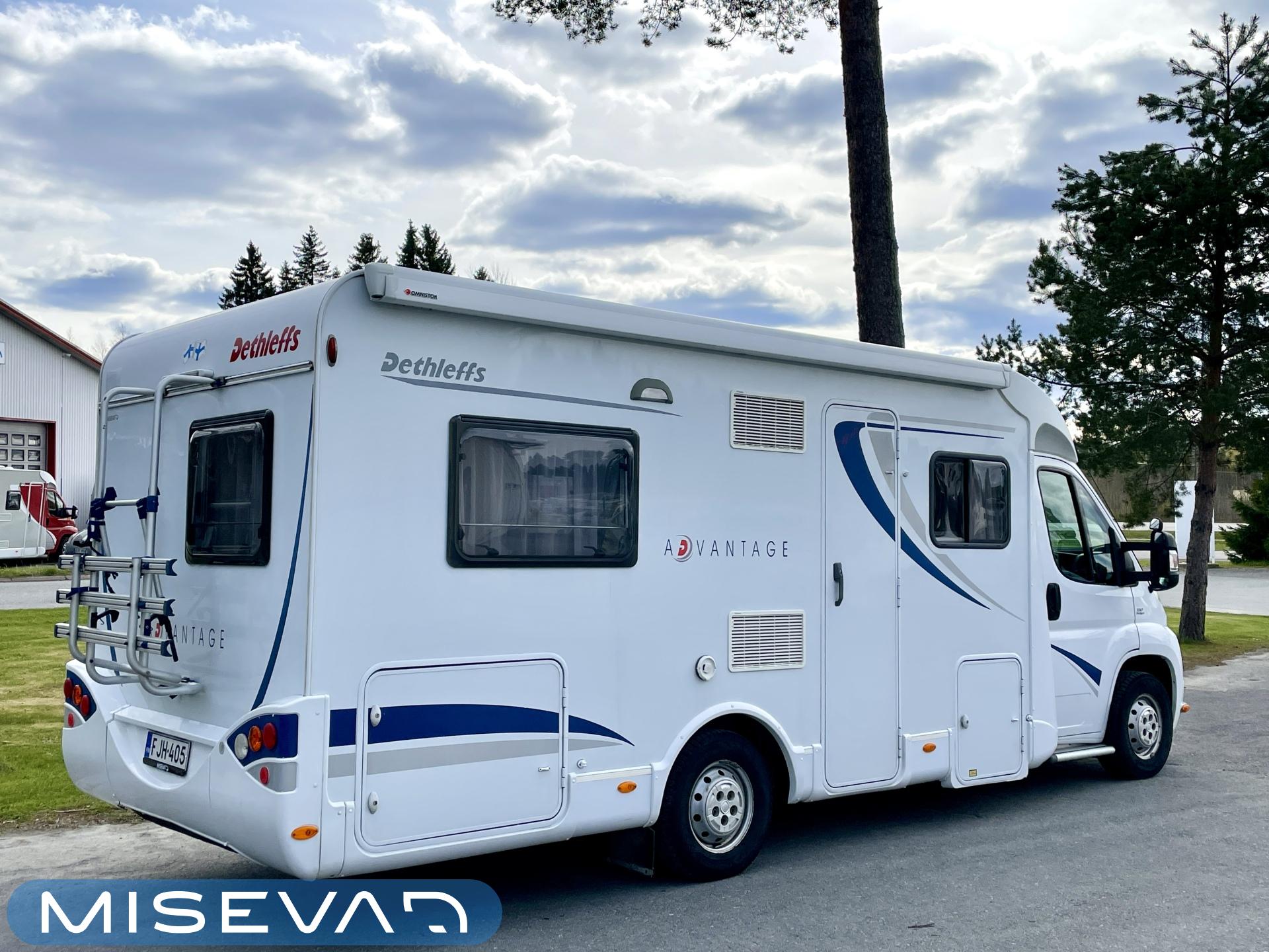 Suosittu Dethleffsin puoli-integroitu matka-auto Alden nestekeskuslämmityksellä. Tämä auto on palvellut vain kahta käyttäjäomistajaa historiansa aikana ja odottaa nyt seuraavaa ohjastajaa reissuihin. Auton takaosasta löytyy pitkittäinen parivuode, sekä WC/kylpyhuonetilat. Vuoteen alle jää säilytystiloja minne on käynti myös ulkopuolisen luukun kautta. Keskelle autoa on asemoitu kettiö isolla jääkapilla varustettuna. Etuosa on pyhitetty pöytäryhmälle minne yhdistyvät kääntyvät ohjaamonpenkit, sekä sivusohva. Tästä saa tarvittaessa sijattua 105×200 kokoisen poikittaisvuoteen. Lämmityksestä huolehtii tehokas (6kw) ja tasaisen lämmön tuottava Alden nestekiertolämmitys. Samassa lämmitinyksikössä on myös sähkövastukset (sähköpatruuna), sekä lämminvesiboileri. Mukavuusvarusteena on lisäksi sähköinen lattianlämmitys. Ohjaamon varusteista mainittakoon automaatti-ilmastointi, vakkari, peruutuskamera ja moottorin esilämmitykseen Webasto. Pihan varusteista markiisi antaa suojaa niin sateelta, kun auringon paisteelta ja polkupyörätkin saa mukaan takaseinälle sijoitettuun pyörätelineeseen.