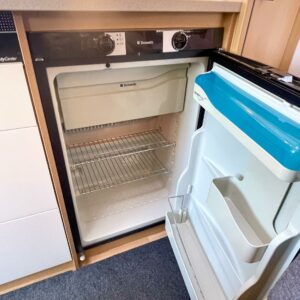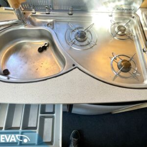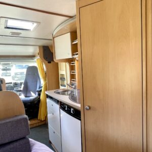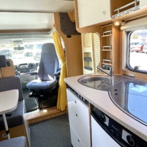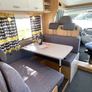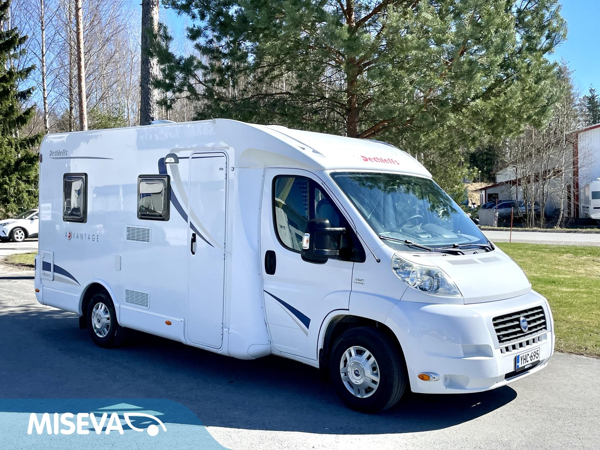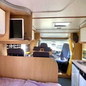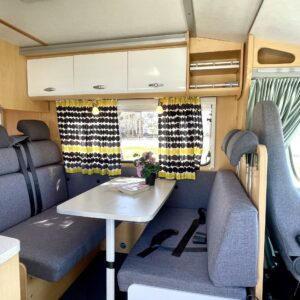 Asiallinen näpsäkän kokoinen puoli-integroitu Dethleffsin matka-auto. Tästä löytyy vyölliset matkustuspaikat kuudelle henkilölle. Auton takaosassa on pitkittäinen parivuode ja sen vieressä tilavat WC/kylpyhuonetilat. Vuoteen alle jää säilytytilaa ja sinne on pääsy myös ulkopuolen luukun kautta. Keskeltä löytyy vastakkain istuttava pöytäryhmä mistä saadaan sijattua tarvittaessa vuode kahdelle henkilölle. Toiselta sivulta löytyy keittiö normaalilla matkailuauton keittiövarustuksella. Apukuljettajan penkki kääntyvää mallia, eli sekin saadaan osaksi pöytäryhmää. Lämmittimenä on Trumaticin nopeasti lämpöä tuottava ilmakeskuslämmitys. Lisää ”höökää” saadaan lämmitysvastuksista (sähköpatruuna) jos ollaan verkkovirtaan kytkeytyneenä. Lisäksi löytyy vielä mukavuusvarusteena sähköinen lattianlämmitys. Ohjaamovarusteista mainittakoon automaatti-ilmastointi, vakionopeuden säädin ja peruutuskamera. Pirteä ja raikkaan oloinen sisutus tuo mukavaa tunnelmaa auton sisätiloihin. Juuri kastsastettu!