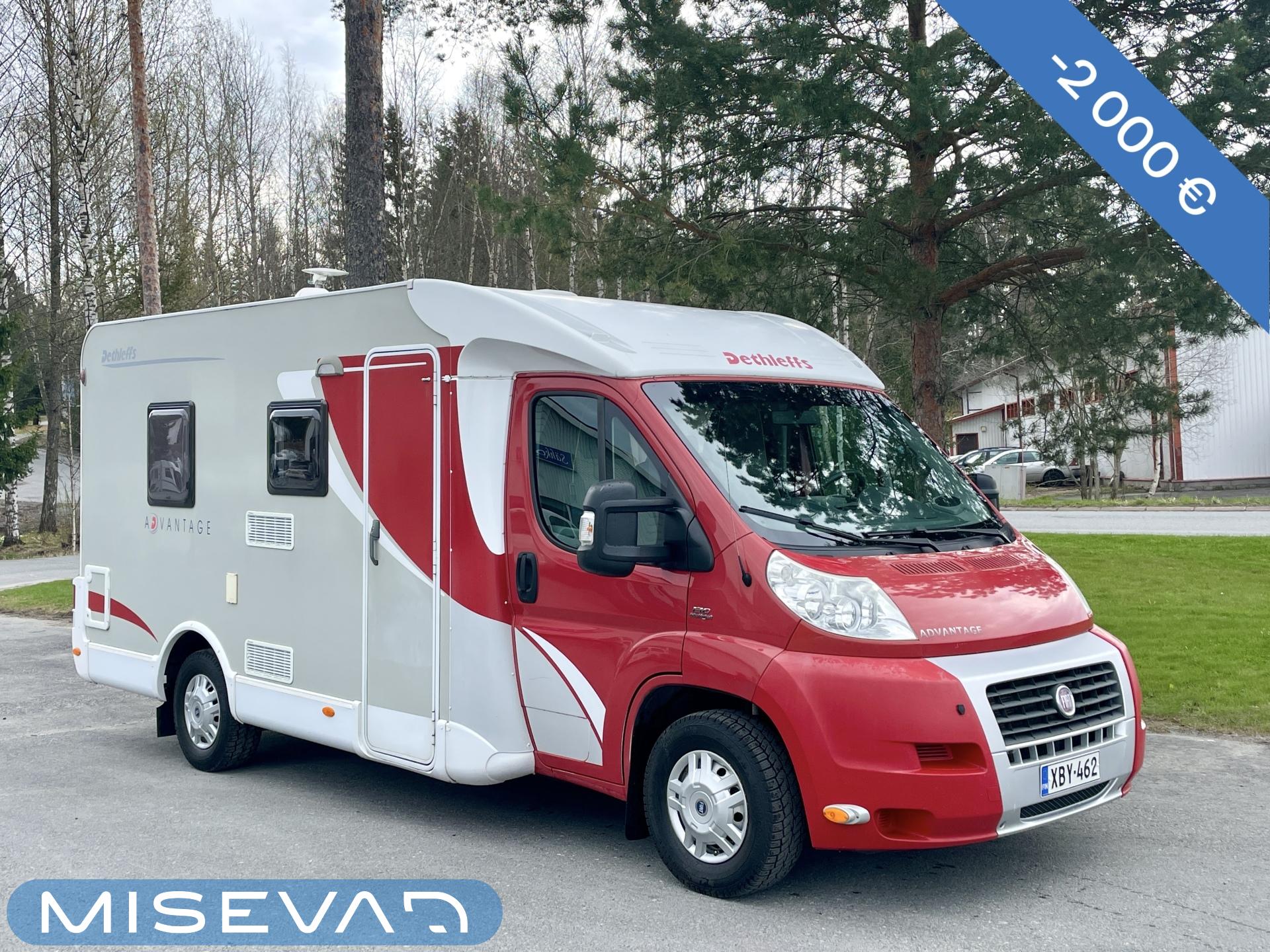 Pirteällä värillä varustettu Dethleffsin puoli-integroitu matkailuauto.