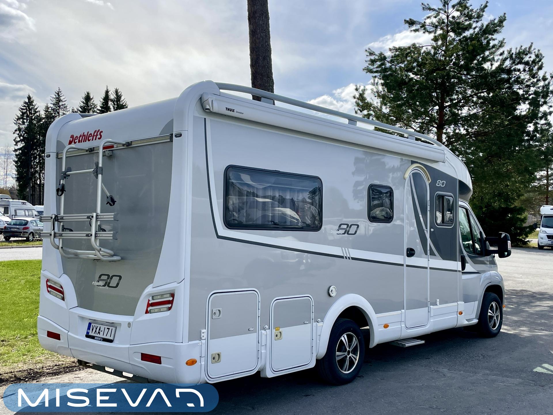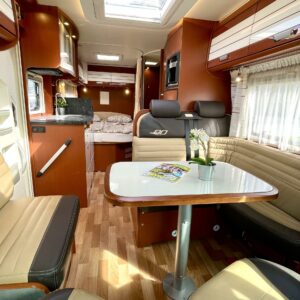 Se löytyy tästä, Juhlamallin Dethleffs tästä suorastaan huokuu eleganssi ja varusteet, on nahkaa, on Aldea lämmönvaihtimella, nestekiertoinen lattialämmitys ja tehtaalla asennettu espressokeitin.