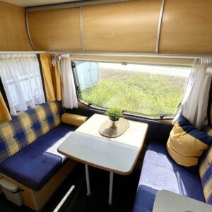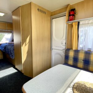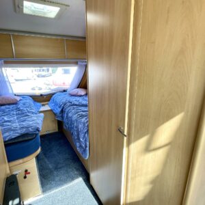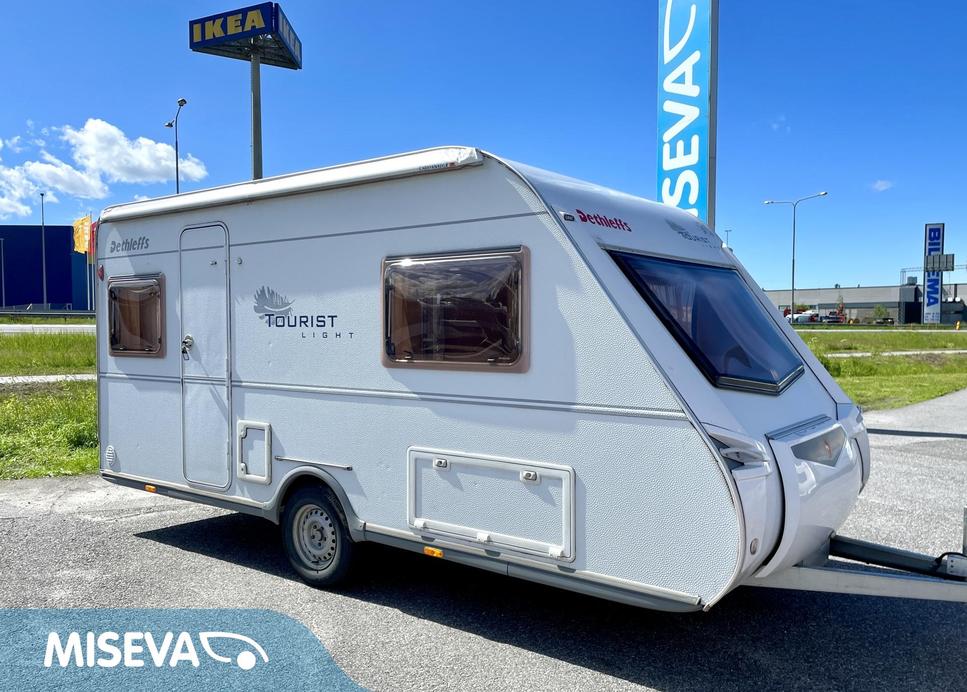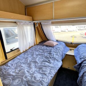 Kevyt lyhyt erillisvuoteinen Dethleffs. Vähän erillainen pohjaratkaisu. mUkavalla korkeudella olevat vuoteet ja pikkainen olohuone takapäässä.