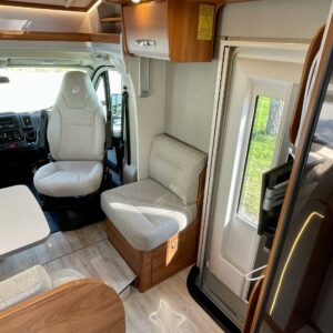 Auton etuosasta löytyy tyylikkäällä harmaalla kankaalla verhoiltu pöytäryhmä lyhyellä sivusohvalla. Lisää petipaikkoja syntyy käden käänteessä katosta sähköllä laskeutuvan nostovuoteen avulla. Keskellä autoa sijaitseva L- keittiö on luonnollisesti varustettu korkealla jääkaappi- pakastimella.