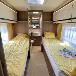 Auton takaosa on pyhitetty nukkumiseen ja hulppeisiin saniteettitiloihin. Mukavat erillisvuoteet ovat matalalla jolloin niihin on helppo kulkea. WC/ pesutilat auton perässä mahdollistavat siistiytymisen myös leiriolosuhteissa.