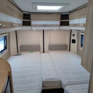 Pohjaratkaisussa edessä kääntyvät etuistuimet. Keskiosassa keittiö, dinette sekä wc -ja suihkutila. Takaosassa pitkittäiset erillisvuoteet ja kaappitilaa.