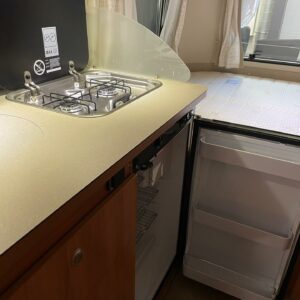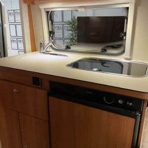 Keskellä vaunua on kompakti keittiö, joka tarjoaa kaiken tarvittavan herkullisten aterioiden valmistukseen.