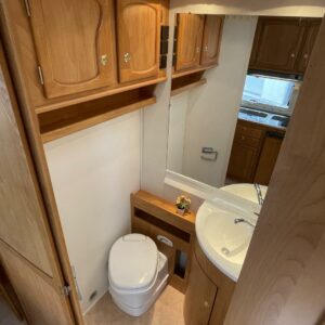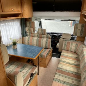 Takana parivuode ja alla iso tallitila, keskellä pesuhuone ja keittiö, edessä pöytäryhmä ja pitkittäinen sohva jopa 7:lle , ohjaamon päällä