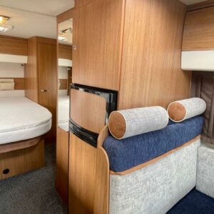 Auton takaosassa muhkea saarekevuode, edessä erittäin valoisa ja viihtyisä pöytäryhmä. Keittiön varustuksen kruunaa iso jääkaappi- pakastin. Erilliset suihku- ja WC- tilat lisäävät käyttömukavuutta.