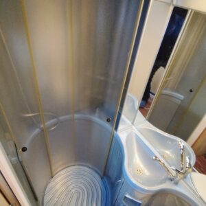 Takana parivuode ja alla aivan mahtavan kokoinen tallitila, keskellä tilava pesuhuone ja keittiö, edessä istuinryhmä 5:lle kääntyvin ohjaamon