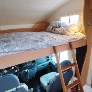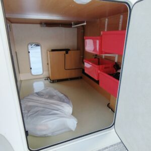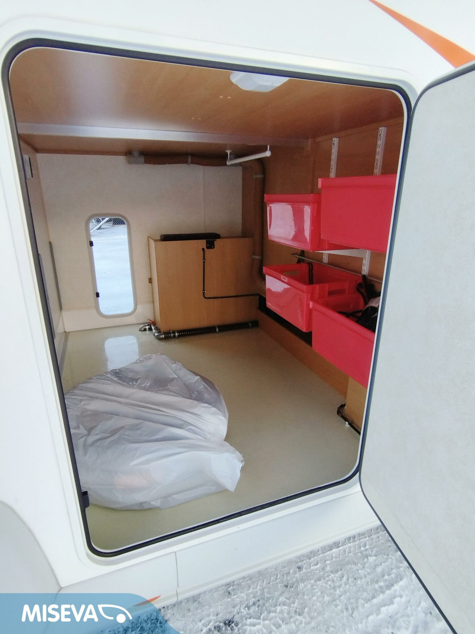 Takana parivuode ja alla aivan mahtavan kokoinen tallitila, keskellä tilava pesuhuone ja keittiö, edessä istuinryhmä 5:lle kääntyvin ohjaamon
