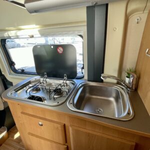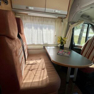 Auton etuosassa on valoisa pöytäryhmä neljälle. Pöytäryhmästä on mahdollista sijata lisävuode pienemmän ihmisen nukkumapaikaksi.