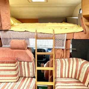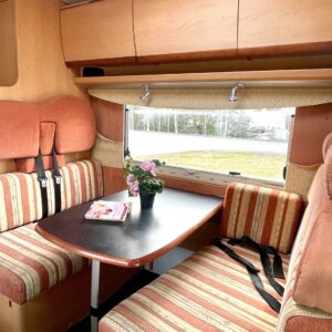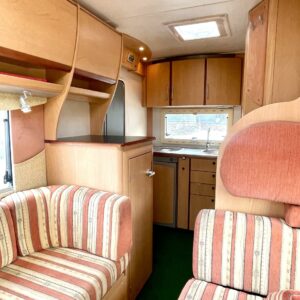 Sisään astutaan auton takaosasta ja vastaan tulee heti keittiö runsain kaapistoin. Takaosassa on myös tilava suihku/WC-yhdisyelmä, missä on oikea suihkukoppi. Auton keskiosassa on todella tilava istuinryhmä oikealla sohvallas, mihin on ilo kutsua naapureita juttutuokiolle. Etuosastav löytyy poikittainen parivuode ohjaamon yllä.