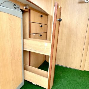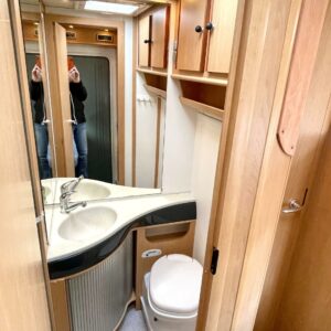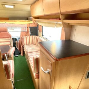 Sisään astutaan auton takaosasta ja vastaan tulee heti keittiö runsain kaapistoin. Takaosassa on myös tilava suihku/WC-yhdisyelmä, missä on oikea suihkukoppi. Auton keskiosassa on todella tilava istuinryhmä oikealla sohvallas, mihin on ilo kutsua naapureita juttutuokiolle. Etuosastav löytyy poikittainen parivuode ohjaamon yllä.