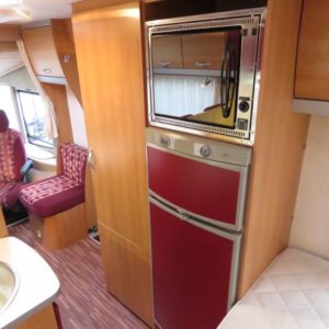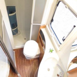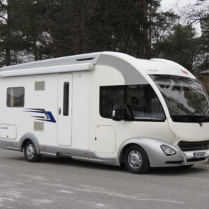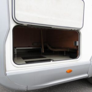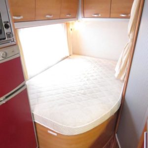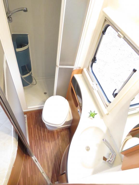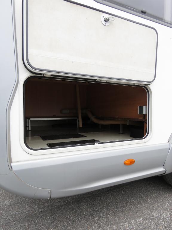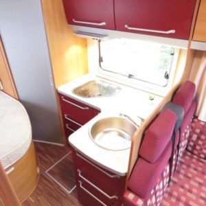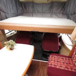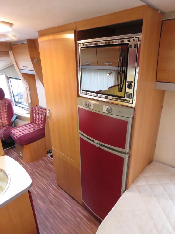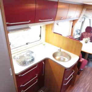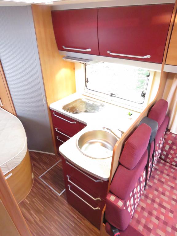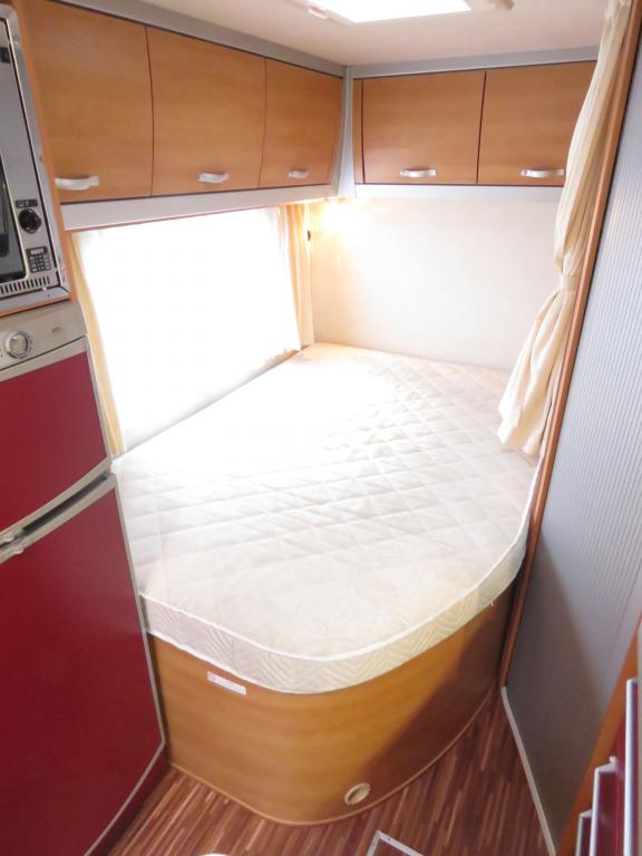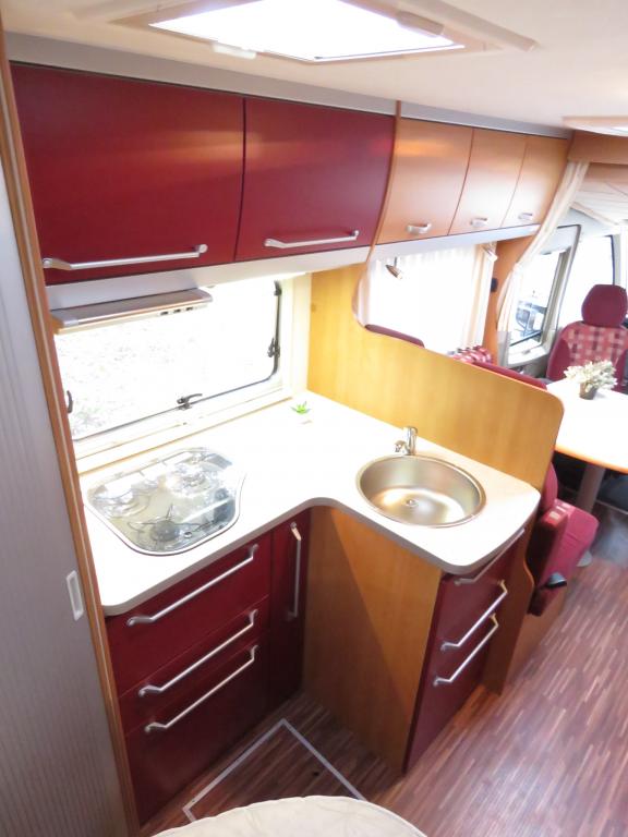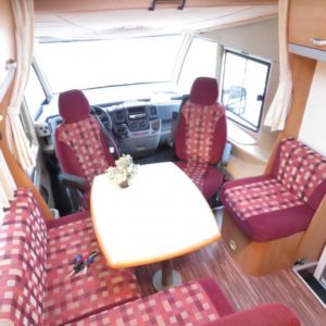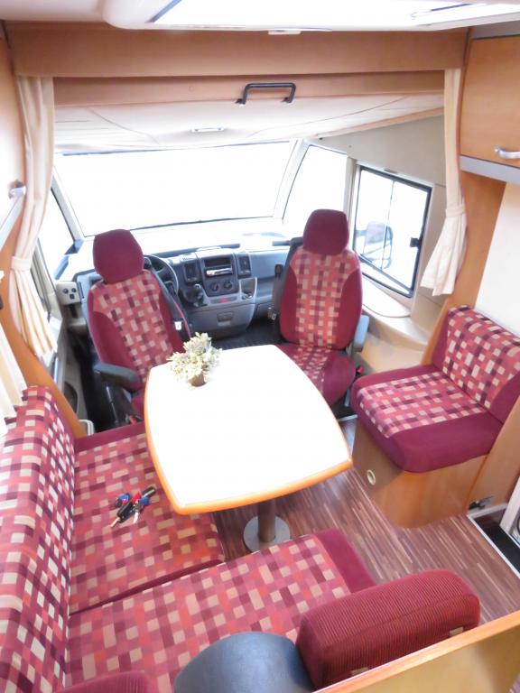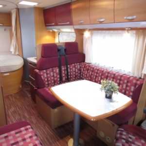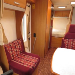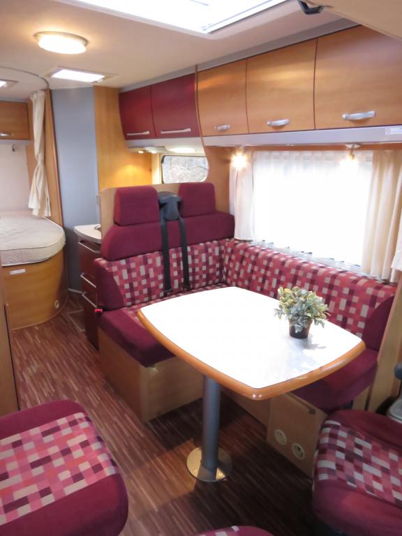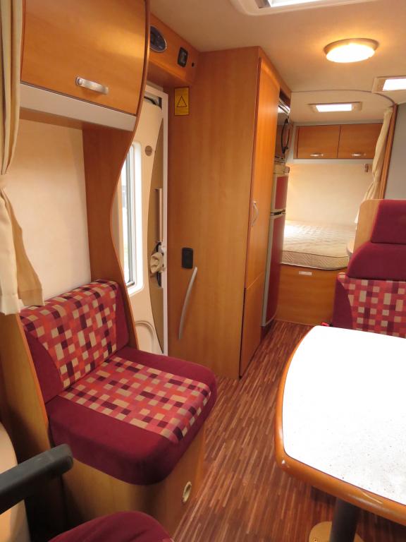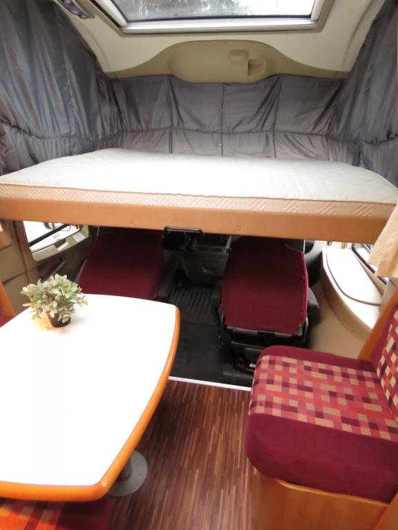 Auton takaosassa pitkittäinen parivuode ja tilava pesuhuone erillisellä suihkunurkkauksella. Edestä löytyy valoisa L- pöytäryhmä sivusohvalla ja ohjaamon päältä laskeutuva toinen parivuode. Keittiön varustukseen kuuluu iso jääkaappi- pakastin ja kaasu- uuni.