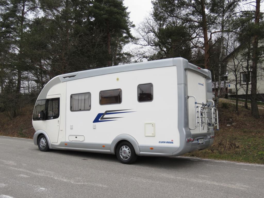Muhkea täysintegroitu Eura Mobil joka tarjoaa mukavat tilat neljän henkilön matkantekoon ja leiriytymiseen.