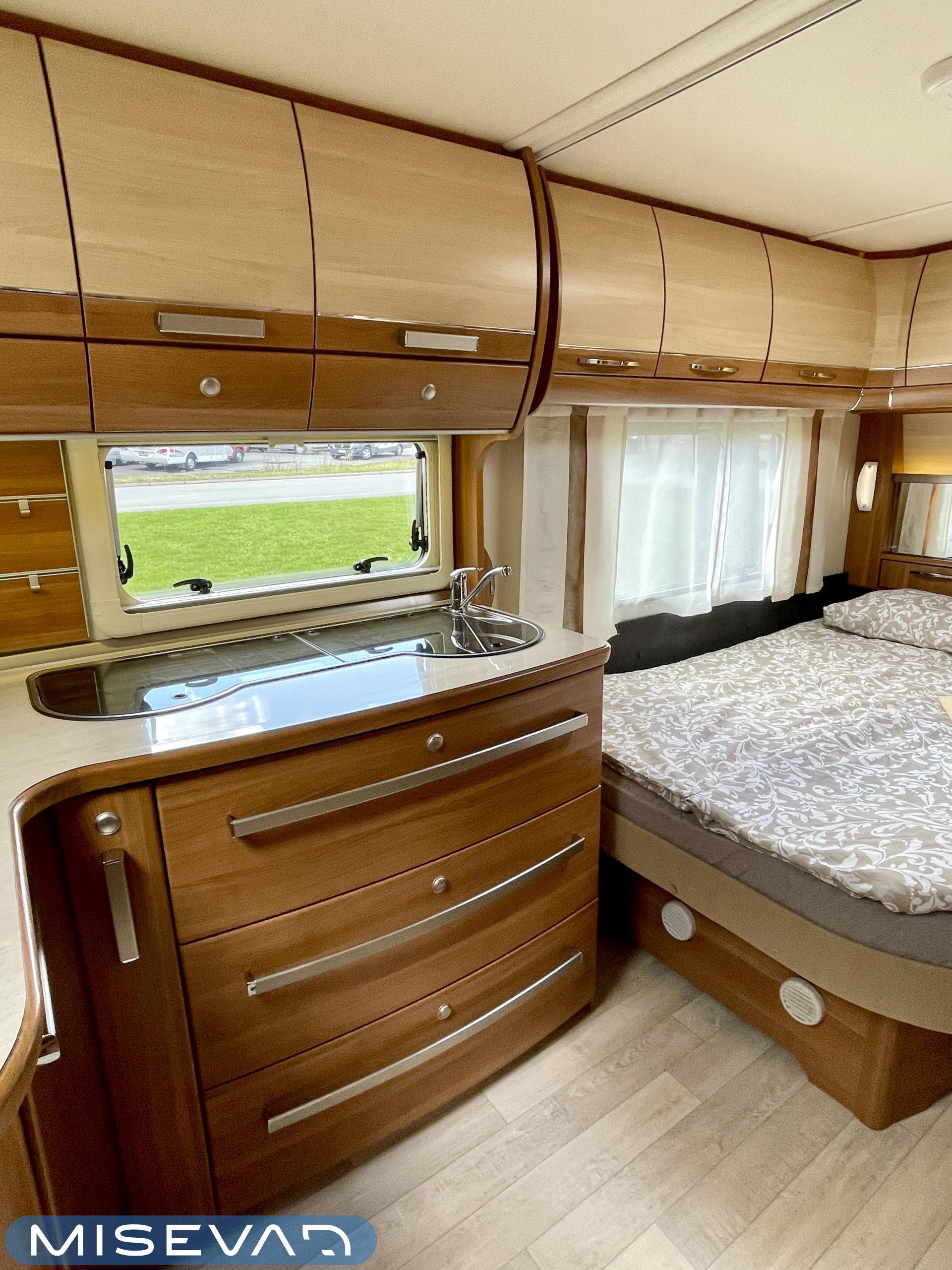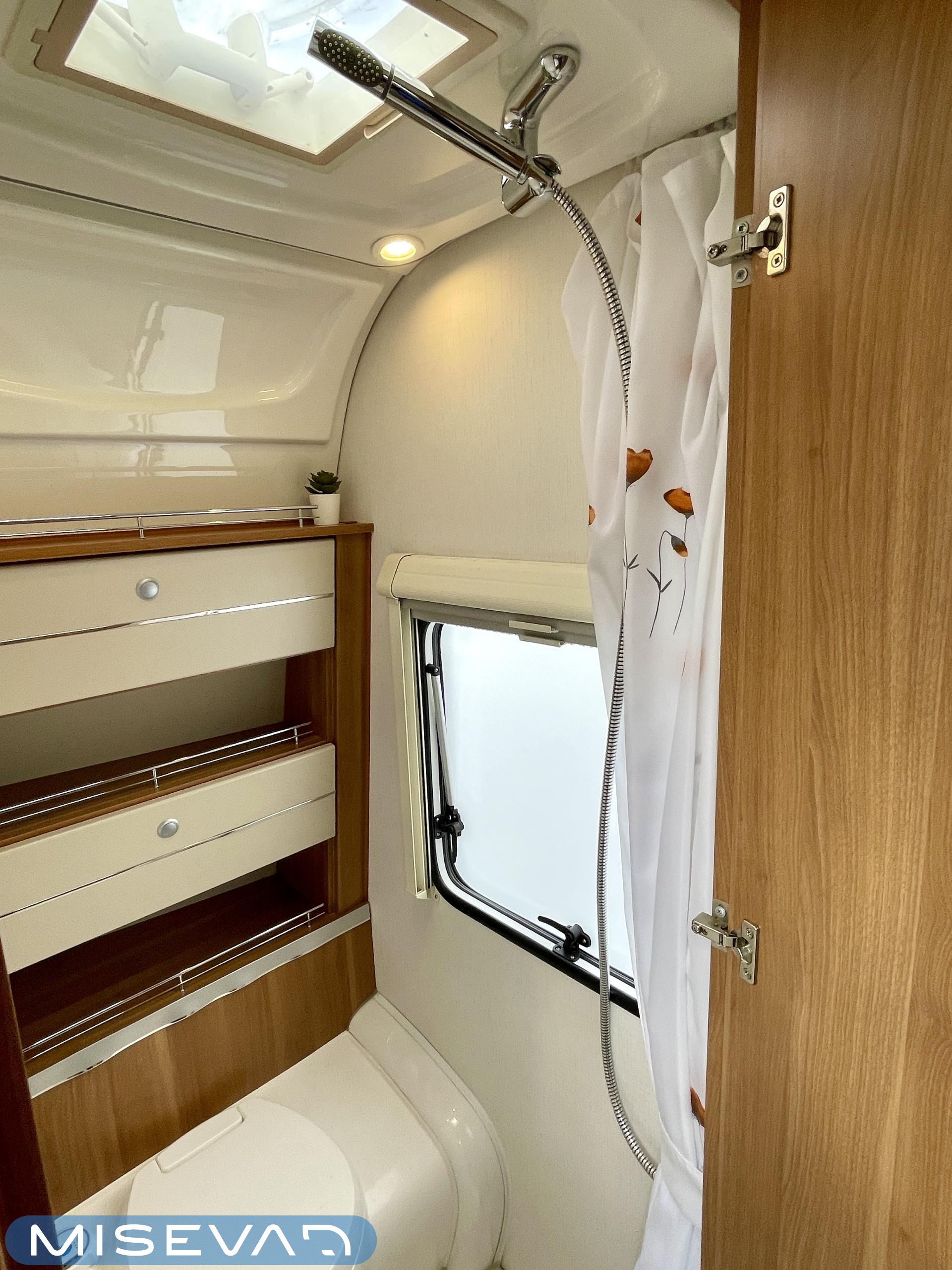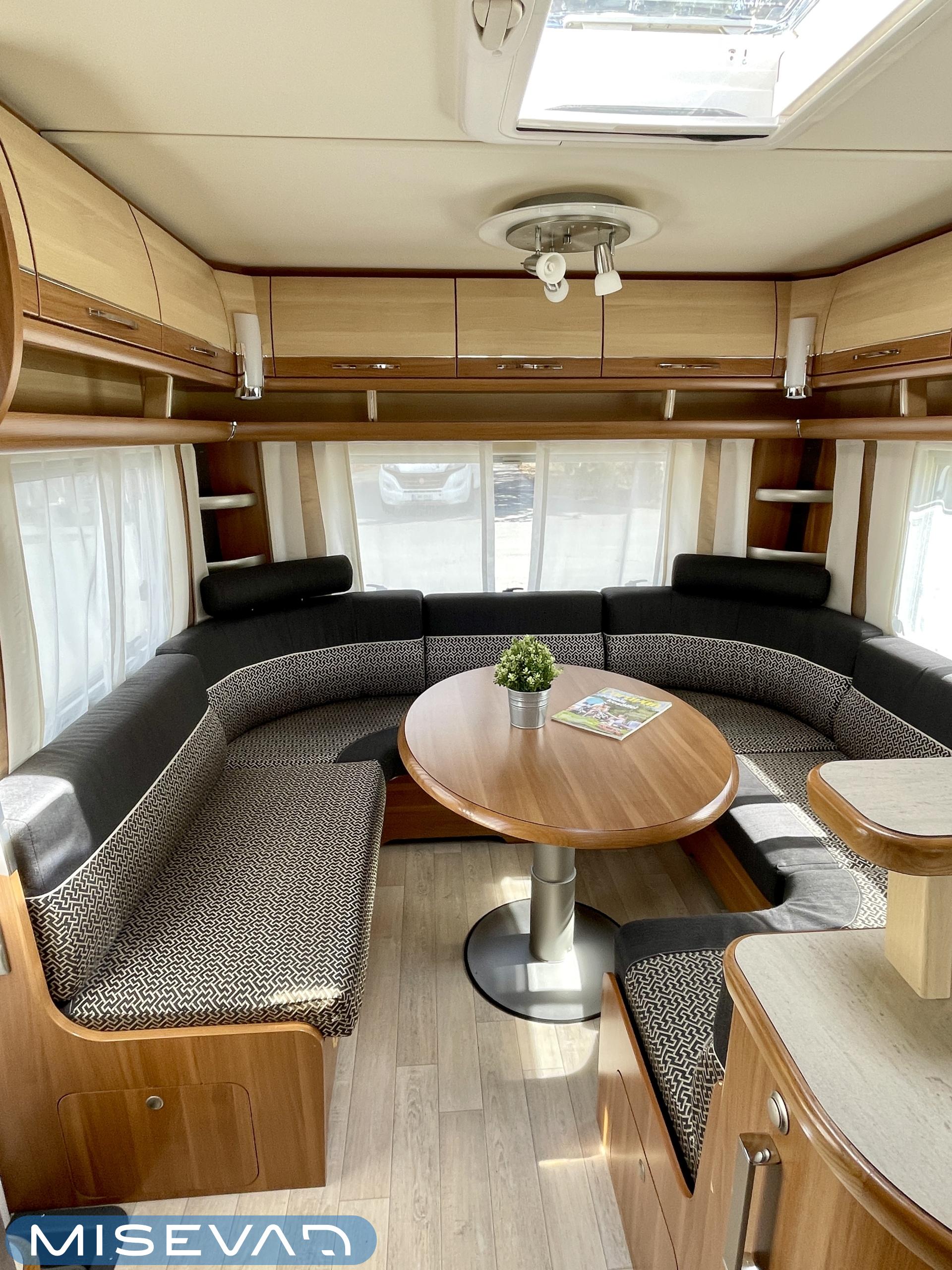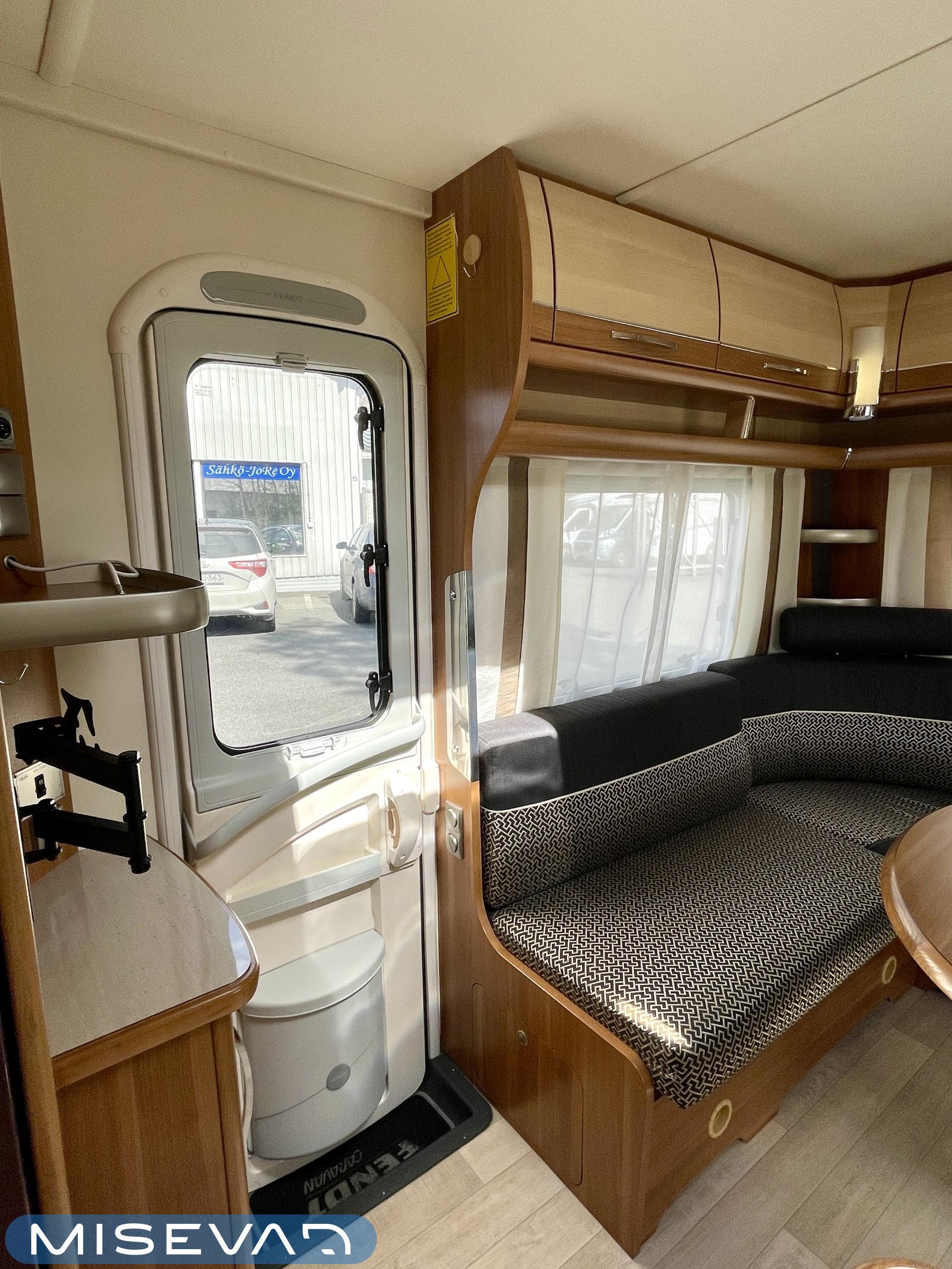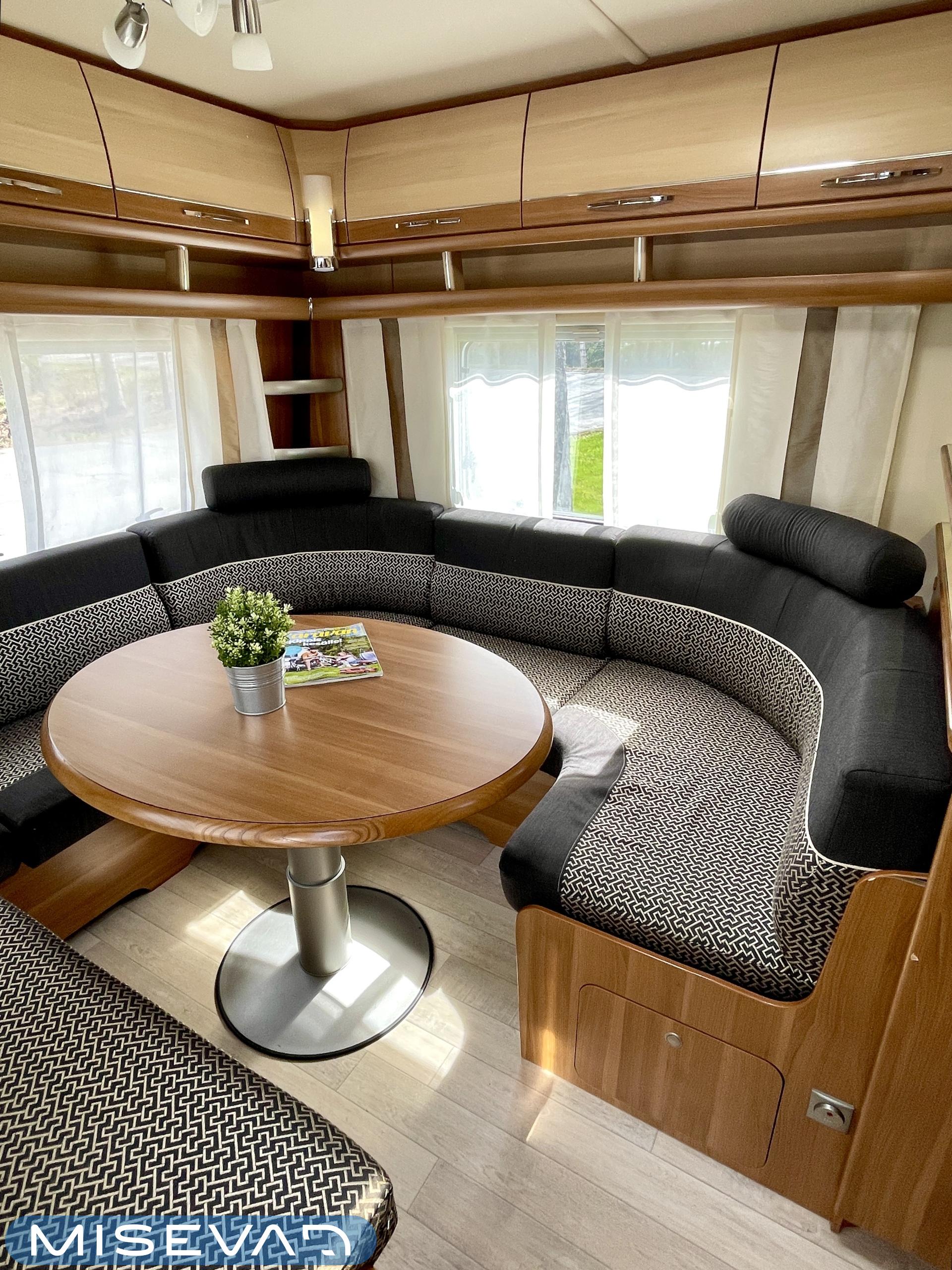 Fendtin hillitty värimaailma ihastuttaa heti oven avauduttua. Vaunun takaosassa on muhkea pöytäryhmä, jonka ympärille mahtuu helposti kuusikin ihmistä viettämään aikaa. Täydellinen tila vaikkapa peli-illalle. Keittiössä on laskutilaa kahdessa tasossa. Kiva lisä karavaanarikokille. Vetolaatikostot on isot ja L-mallinen pöytä kätkee sisäänsä yllättävän paljon säilytystilaa. Päätyyn on tehty innovatiivinen säilytysratkaisu. Kaappitilaa on kivasti muutenkin ympäri vaunua. Etuosan sänky on mukavan leveä ja alta löytyy tila, vaikkapa ulkokalusteille. Ulkoluukusta pääsee myös ottamaan terassituolit esille. WC:stä löytyy suihku mahdollisuus. Kaikenkaikkiaan vaunu tarjoaa juuri sitä mitä lupaakin. Siistiä tyylikkyyttä, näppärässä kokoluokassa. Tyylikäs helmi!