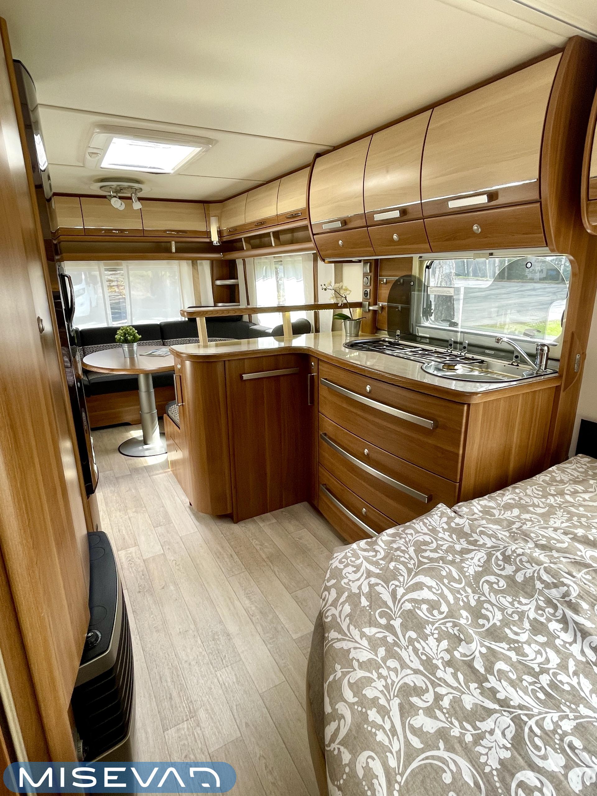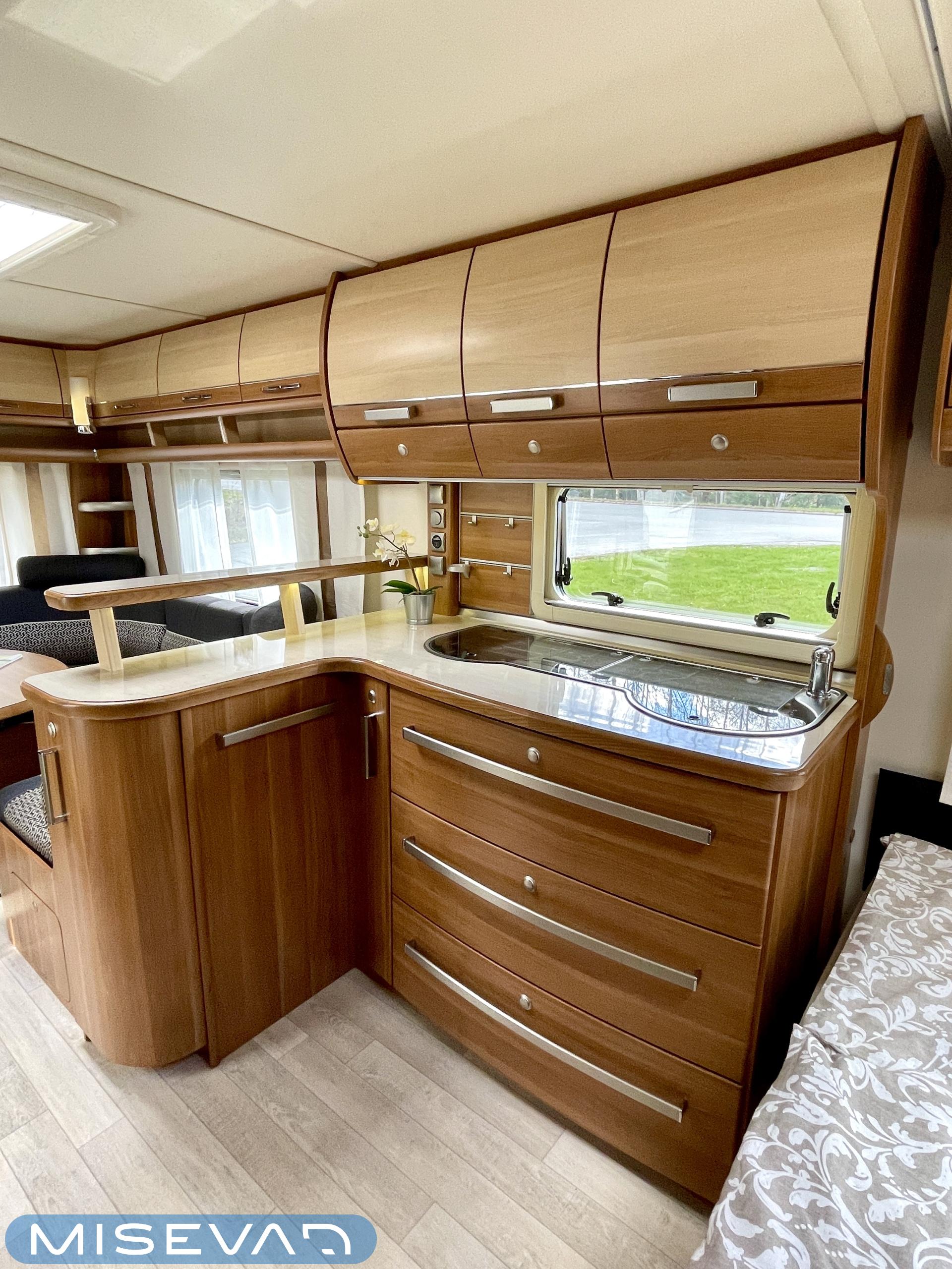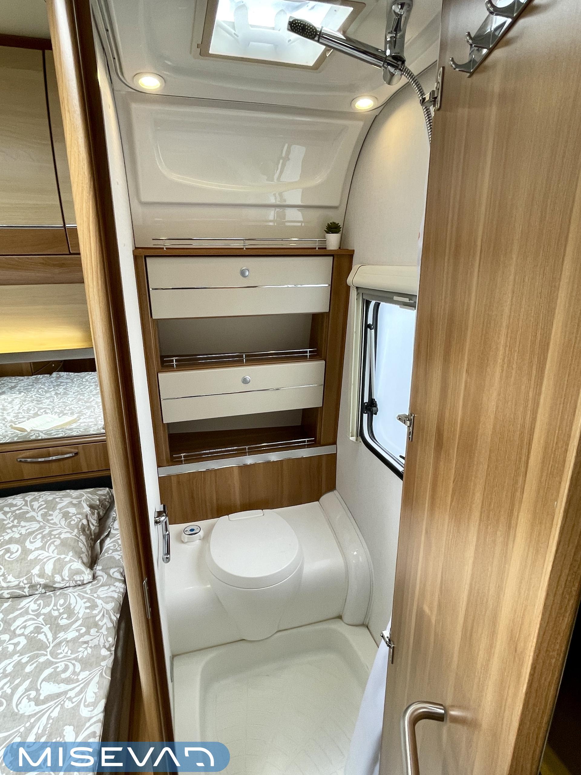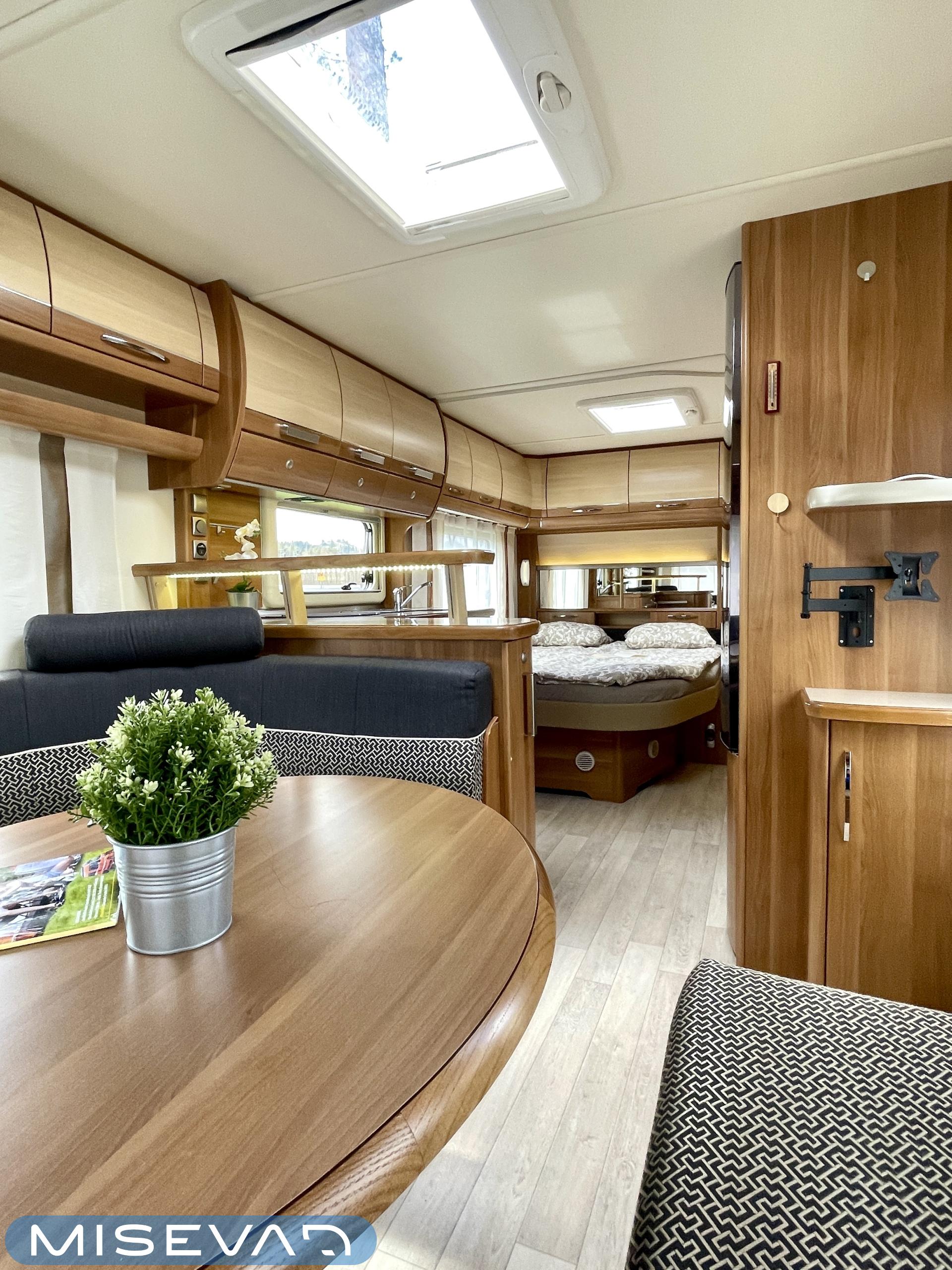 Fendtin hillitty värimaailma ihastuttaa heti oven avauduttua. Vaunun takaosassa on muhkea pöytäryhmä, jonka ympärille mahtuu helposti kuusikin ihmistä viettämään aikaa. Täydellinen tila vaikkapa peli-illalle. Keittiössä on laskutilaa kahdessa tasossa. Kiva lisä karavaanarikokille. Vetolaatikostot on isot ja L-mallinen pöytä kätkee sisäänsä yllättävän paljon säilytystilaa. Päätyyn on tehty innovatiivinen säilytysratkaisu. Kaappitilaa on kivasti muutenkin ympäri vaunua. Etuosan sänky on mukavan leveä ja alta löytyy tila, vaikkapa ulkokalusteille. Ulkoluukusta pääsee myös ottamaan terassituolit esille. WC:stä löytyy suihku mahdollisuus. Kaikenkaikkiaan vaunu tarjoaa juuri sitä mitä lupaakin. Siistiä tyylikkyyttä, näppärässä kokoluokassa. Tyylikäs helmi!