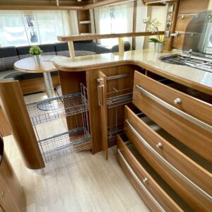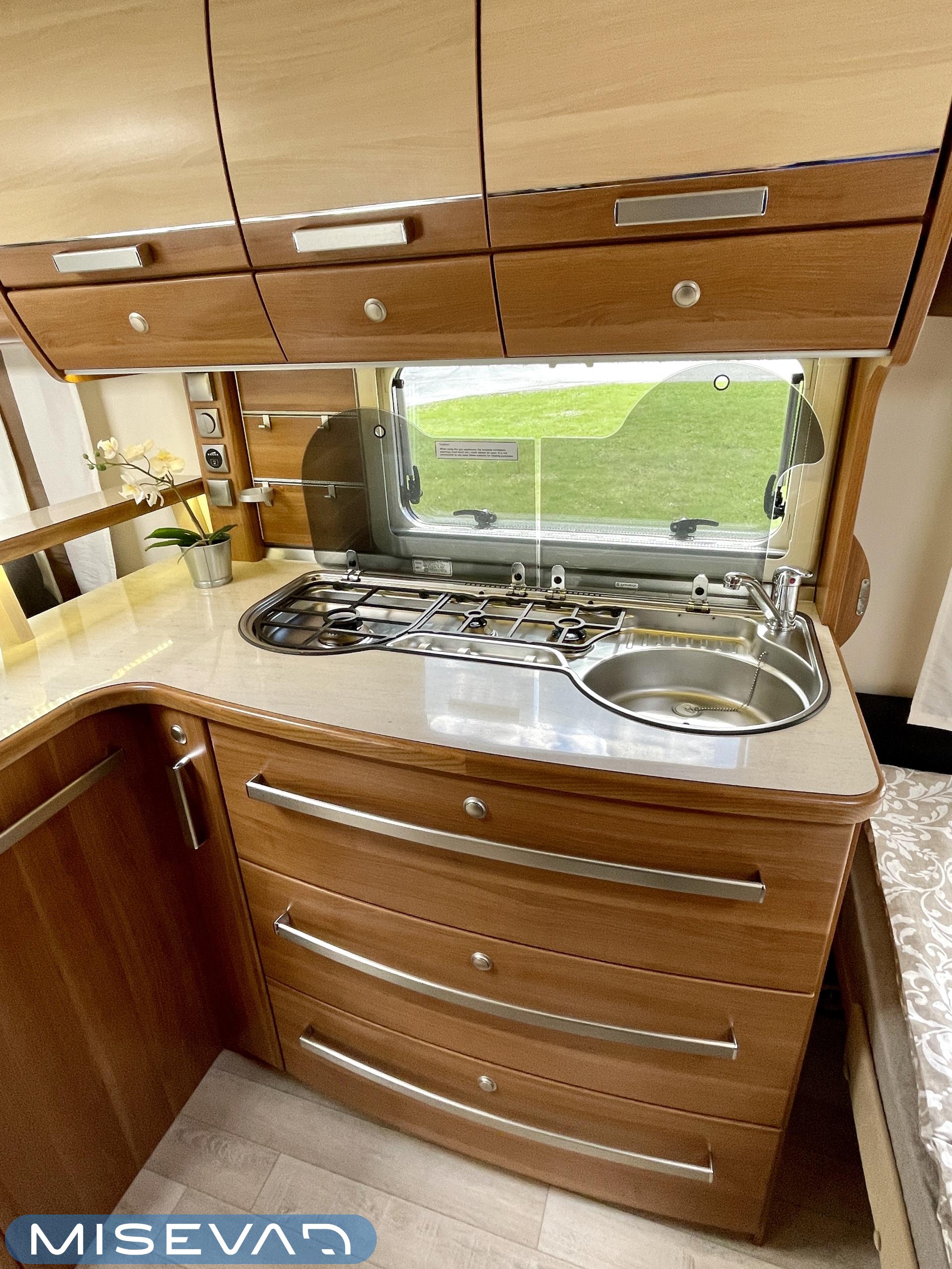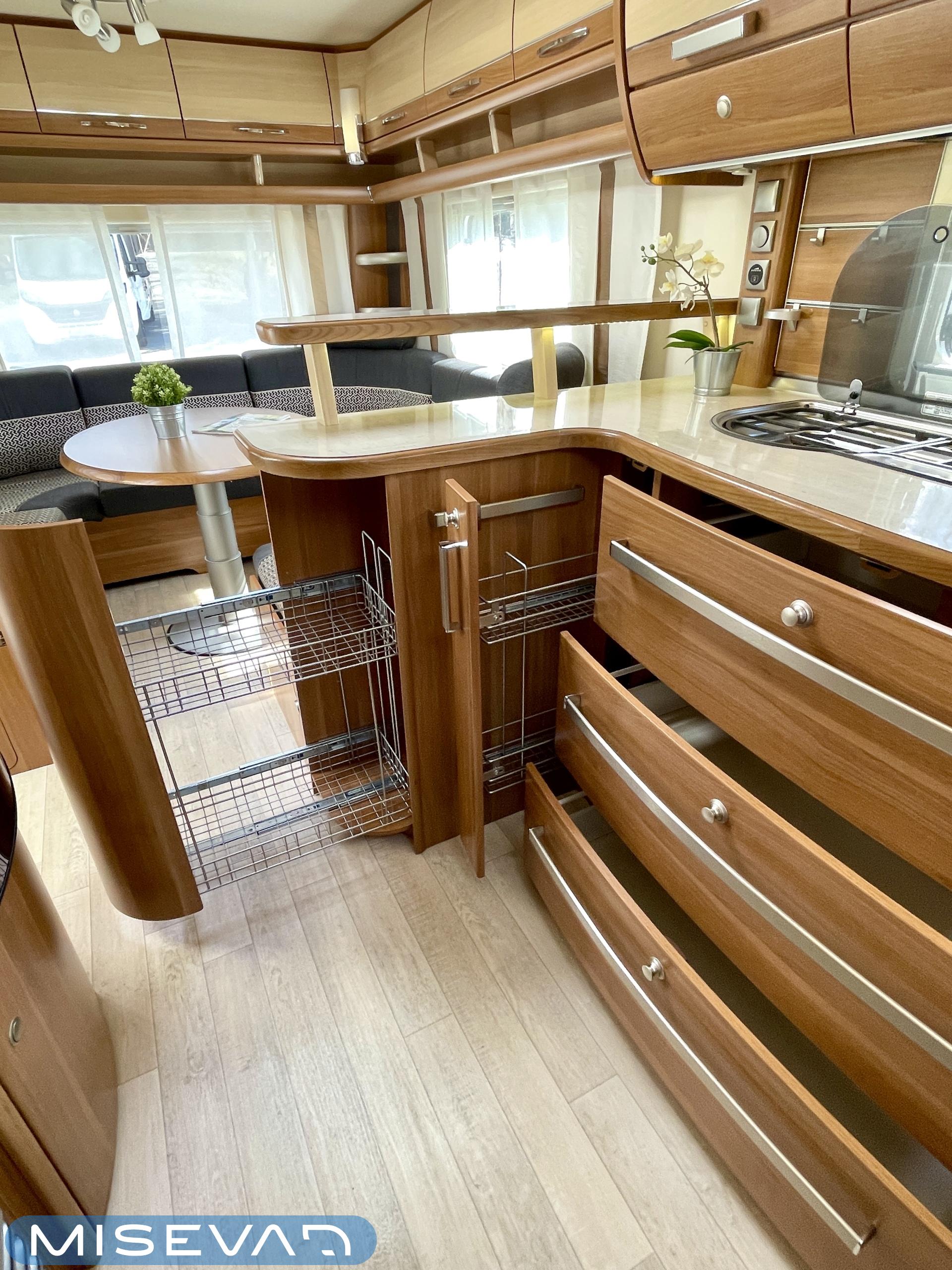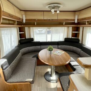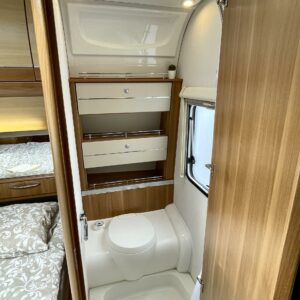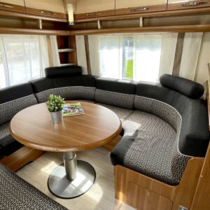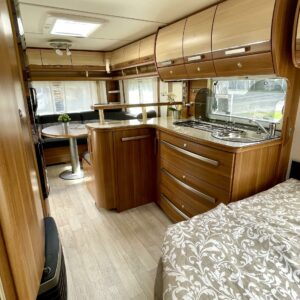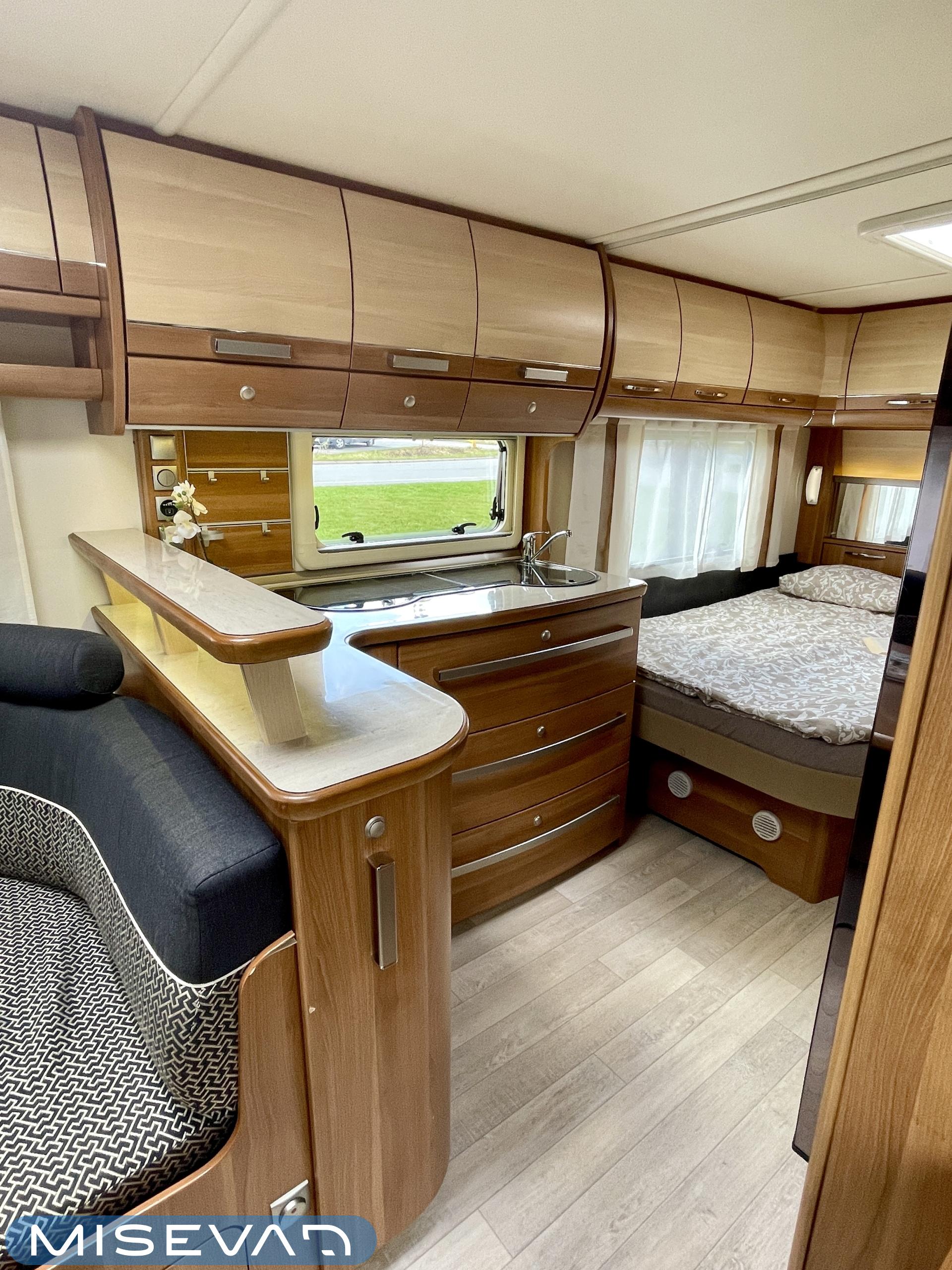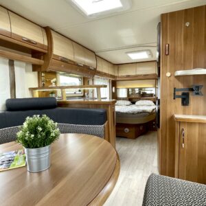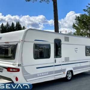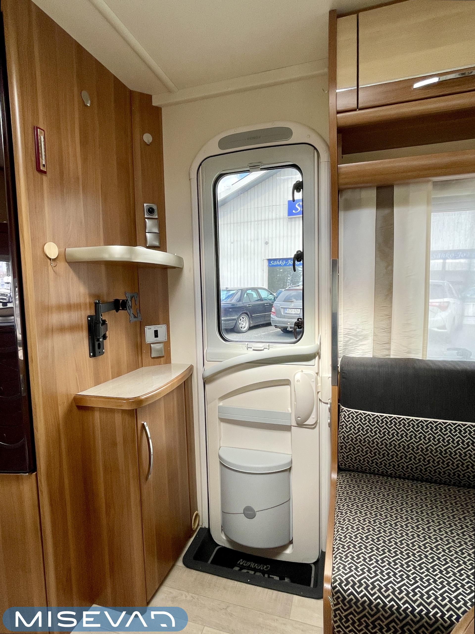 Fendtin hillitty värimaailma ihastuttaa heti oven avauduttua. Vaunun takaosassa on muhkea pöytäryhmä, jonka ympärille mahtuu helposti kuusikin ihmistä viettämään aikaa. Täydellinen tila vaikkapa peli-illalle. Keittiössä on laskutilaa kahdessa tasossa. Kiva lisä karavaanarikokille. Vetolaatikostot on isot ja L-mallinen pöytä kätkee sisäänsä yllättävän paljon säilytystilaa. Päätyyn on tehty innovatiivinen säilytysratkaisu. Kaappitilaa on kivasti muutenkin ympäri vaunua. Etuosan sänky on mukavan leveä ja alta löytyy tila, vaikkapa ulkokalusteille. Ulkoluukusta pääsee myös ottamaan terassituolit esille. WC:stä löytyy suihku mahdollisuus. Kaikenkaikkiaan vaunu tarjoaa juuri sitä mitä lupaakin. Siistiä tyylikkyyttä, näppärässä kokoluokassa. Tyylikäs helmi!