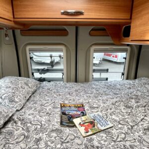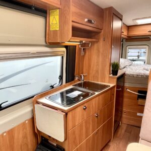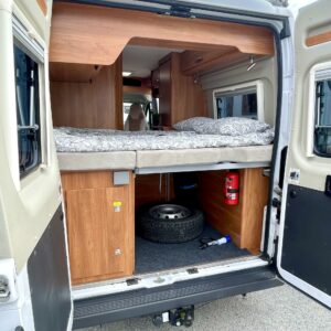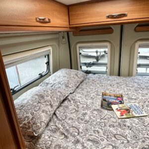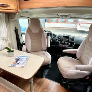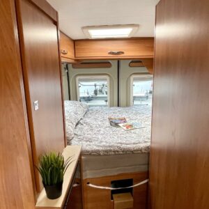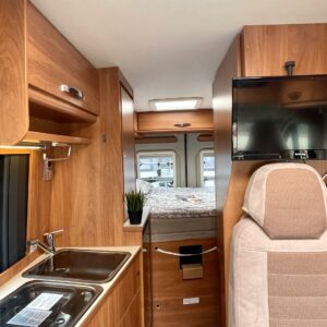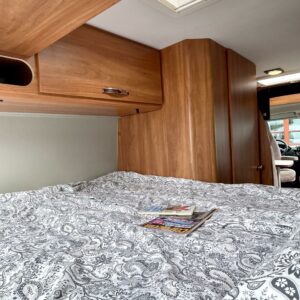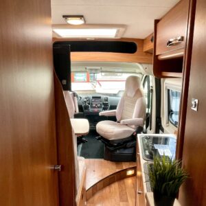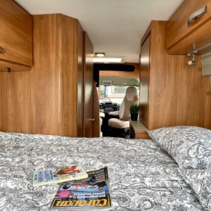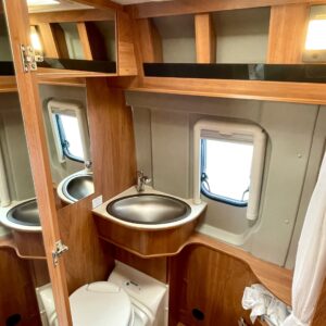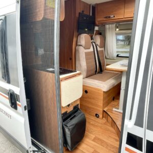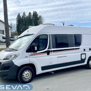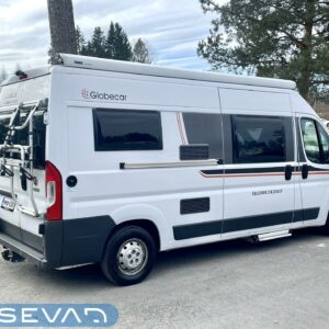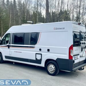Tämän retkiksen värimaailma on mietitty mukavaksi ja tylikkääksi kokonaisuudeksi. Ja kun sivuoven laittaa kiinni, huomaa heti automaattisen ovensulkijan. Tämän retkiksen sivuovea, ei tarvitse siis paiskoa. Sisätiloista löytyy myös muutama säilytykseen liittyvä loistava ratkaisu. Säilytystilat retkiksissä on kompromissi yleisesti tilojen suhteen. Joten jokainen ylimääräinen kolo tai laskutila on aina tervetullut. Keittiössä laskutilaa on saatu kätevällä lisäpöydällä ja ruokailutilan jalkatilassa on kaksi kätevää säilytyslaatikkoa. Auton keskeltä löytyy suihku ja wc-tila. Ja tässä retkiksessä suihkuttelut onnistuu myös ikkunan kautta ulkona. Takana on poikittainen parisänky ja kaapit säilytystä varten, vaikkapa vaatteille. Tässä mallissa lisätilaa saadaan myös sängyn ja keittiön välisellä kaapilla. Ihan kiva extra. Keittiössä on käytössä kätevät vetolaatikostot ja sivuovi avaa maailman kokkailuun maisemien muodossa. Hyttysverkkohan löytyy myös. Tule tutustumaan Globecariin ja lähde pihalta kohti unelmiesi reissua!