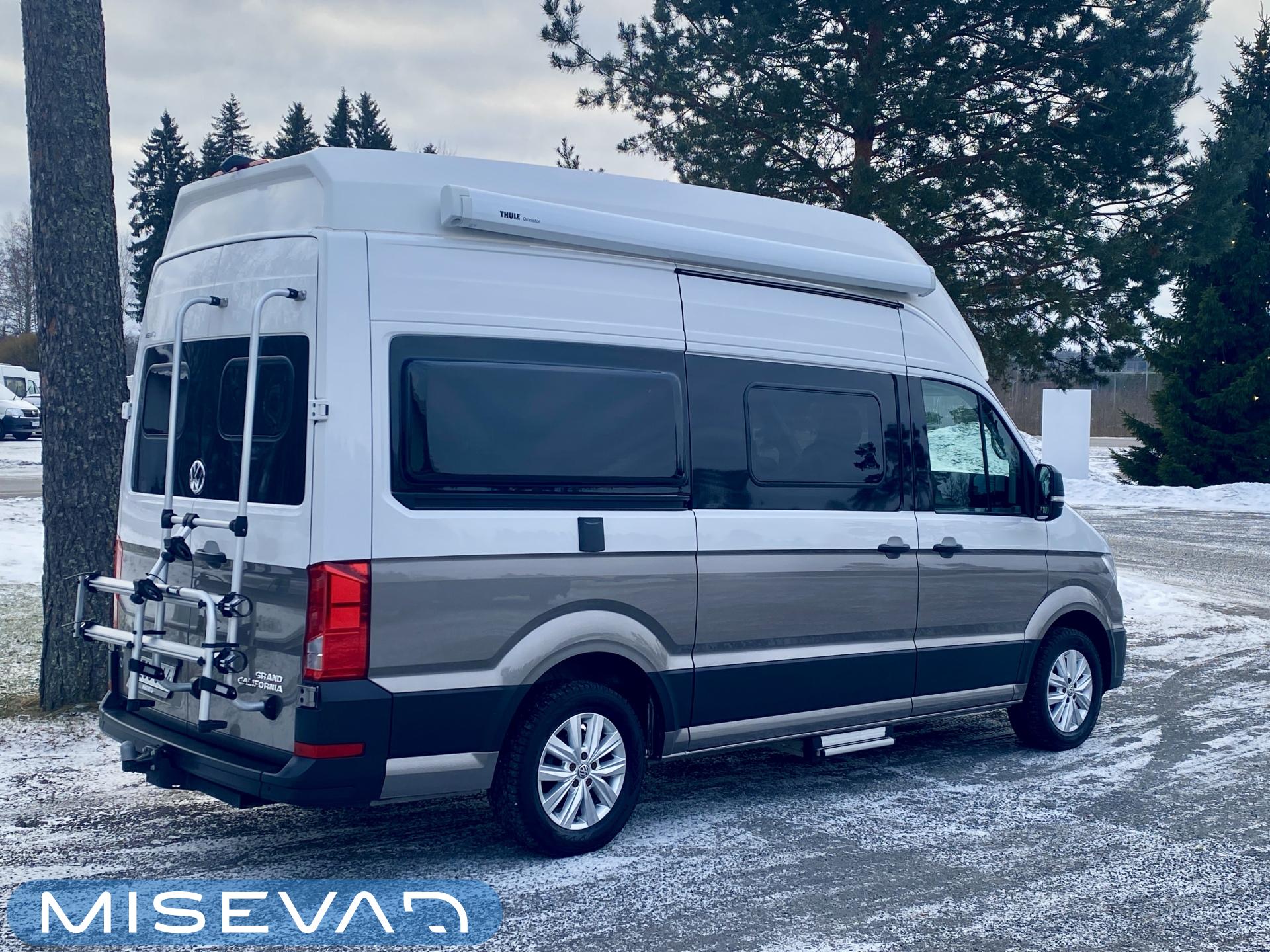 Grand California 600, ihanteellinen matkailuauto perheen yhteisille matkoille. 6 metrin pituus tekee autosta kompaktin ja helposti käsiteltävän pienemmässäkin tilassa. Auto on myös tarpeeksi tilava nelihenkiselle perheelle. Tämän mahdollistaa uudenlainen camper-katto ylävuoteineen. Keittiöstä löytyy kaikki tarpeelliset toiminnot ruoan laittoon ja jääkaapi on kätevästi vetolaatikkomallinen. Jääkaapista löytyy tilavuutta peräti 70 litraa. Autosta löytyy myös tyylikkäät WC/kylpyhuonetilat ja extrana vielä ulkosuihku auton takaosassa. Lämmittimenä on Trumaticin ilmakeskuslämmitys ja sähkövastuksilla varustettuna. Pihan puolelle lisätilaa saadaan markiisin avulla. Alustana on VW Crafter mikä on ajomukavuudeltaan erinomainen. Luonnollisestihan tästä löytyvät kaikki nykyaikaiset turva, sekä mukavuusvarusteet. Infokeskuksena on iso kosketusnäyttö mikä toimii myös peruutuskameran näyttönä. Vetokoukkuun saa kytkeä 2000kg jarrullisen kärrin ja 750kg jarruttoman kärrin. Ihan mahtavan hieno, tyylikäs ja moderni paketti valmiina reissuun!