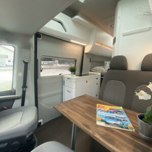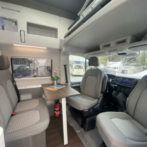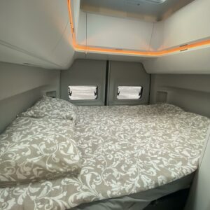 Takana poikittainen parivuode minkä alapuolella mukavasti säilytystilaa. Keskellä WC/kylpyhuonetilat sekä keittiö. Edessä pöytäryhmä minne yhdistyvät kääntyvät ohjaamon penkit. Pöytäryhmän yläpuolella camber ylävuode kahdelle henkilölle.