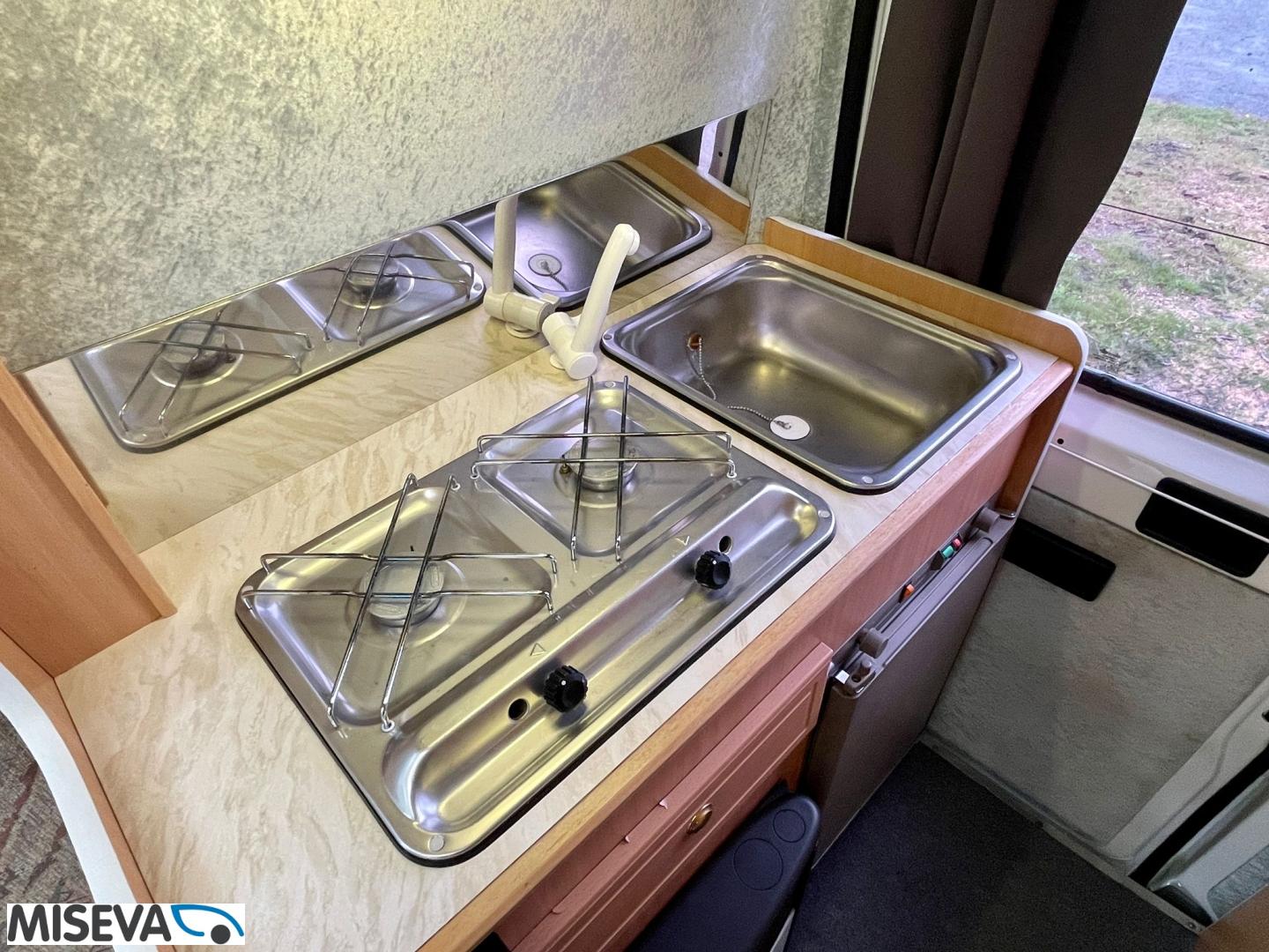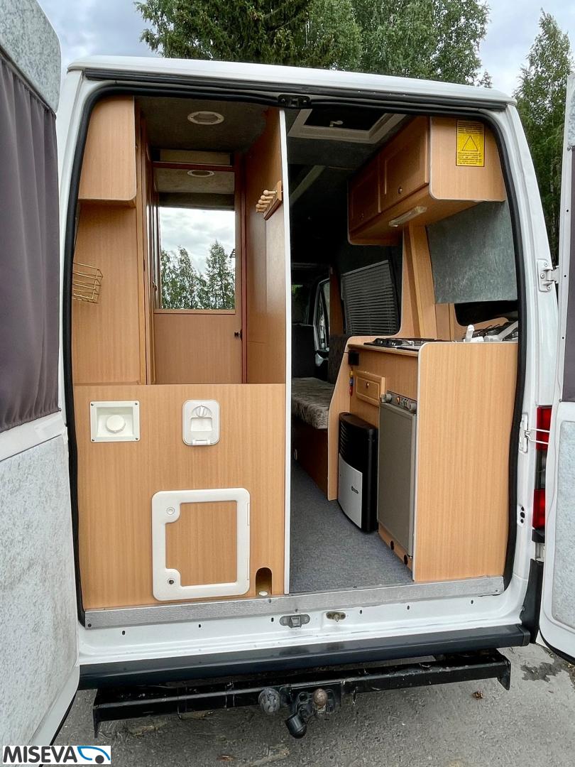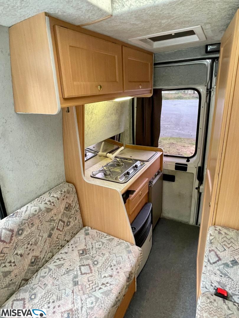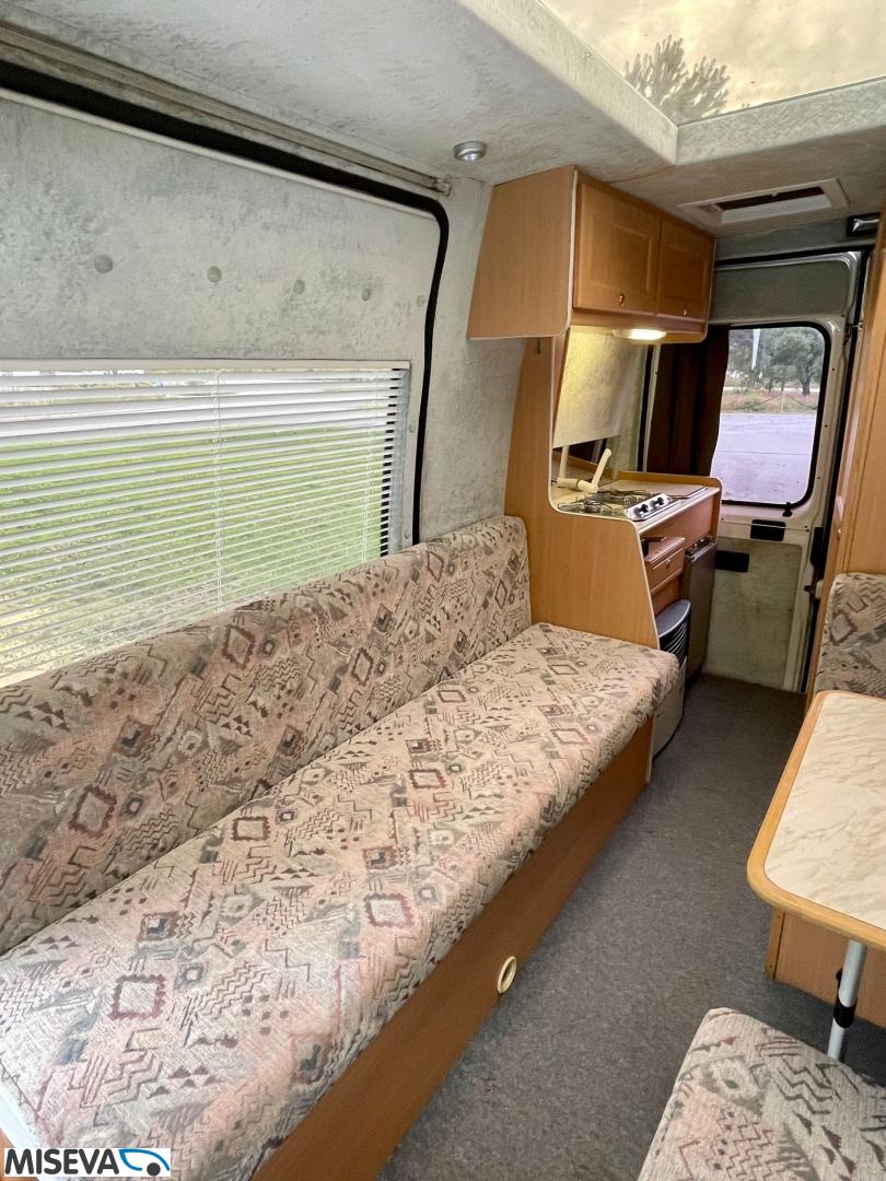 Auton etuosassa pitkä sohva ja vastakkain istuttava pöytäryhmä joka sijattavissa vuoteeksi. Auton takaosasta löytyy keittiö ja WC.