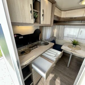 Truma, Jääkaappi, Kasetti WC, Kasettiverhot, Kattoluukku, Lattialämmitys, Liesi, Lämminvesiboileri, Pakastelokero, Parivuode, Pesuallas, Sähköpatruuna, TV-antenni tai lautasantenni, Tukijalat, Lattialämmitys (sähkö), kwh-mittari, jenkkijääkaappi, liesituuletin, Asuinosan hyttysovi/verho