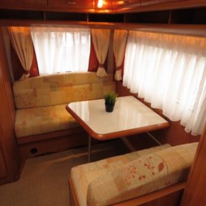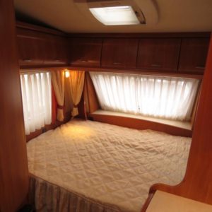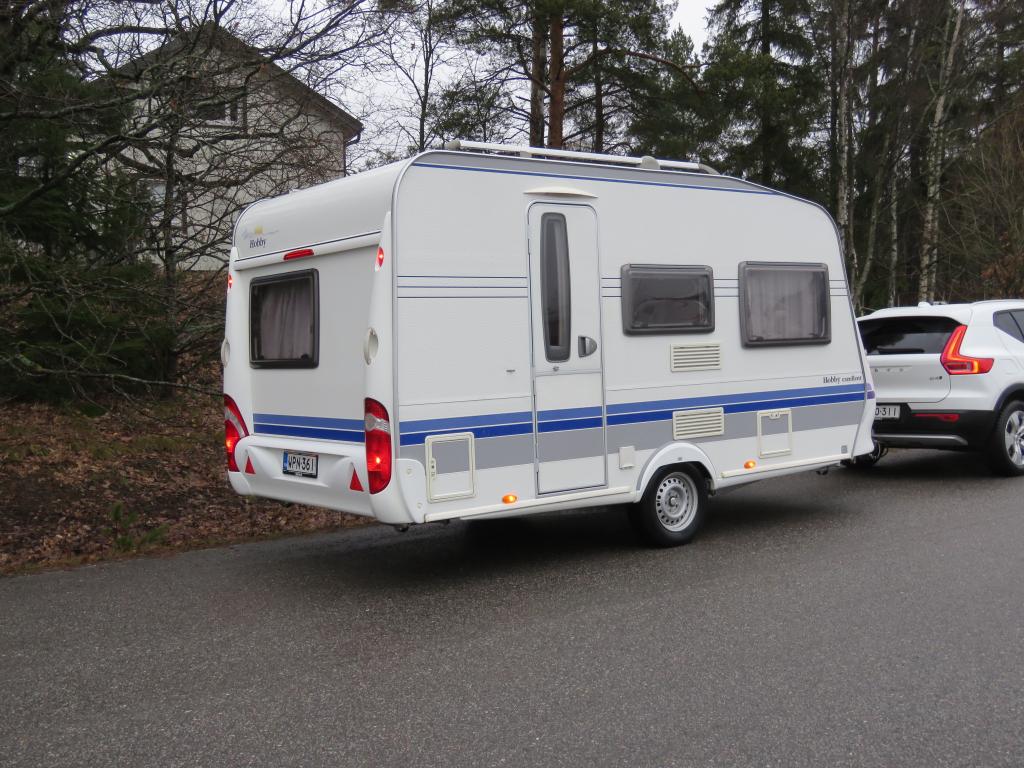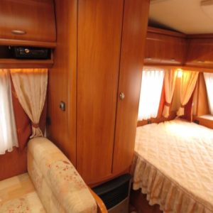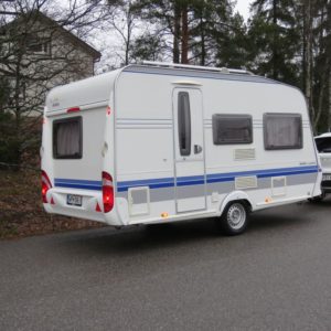 Näppärän kokoinen ja hienossa kunnossa oleva vaunu. Edessä parivuode joustinpatjalla, keskellä keittiö ja takana istuinryhmä josta sijattavissa toinen parivuode. Takakulmassa wc.