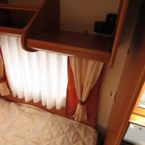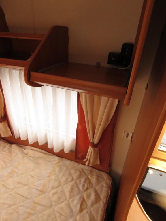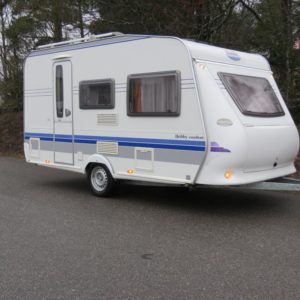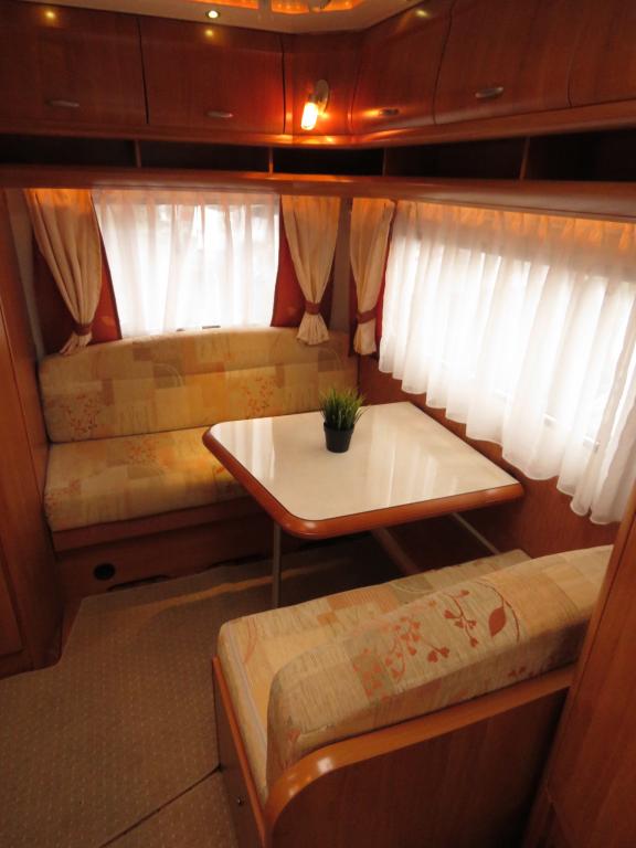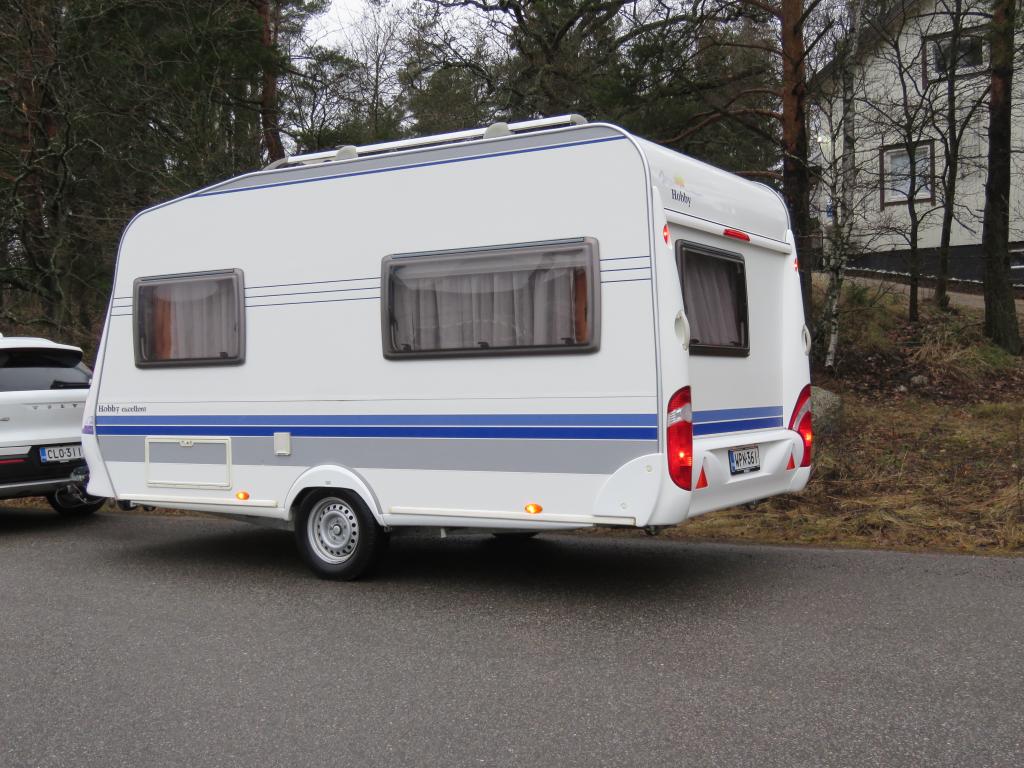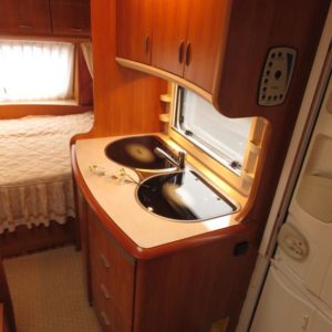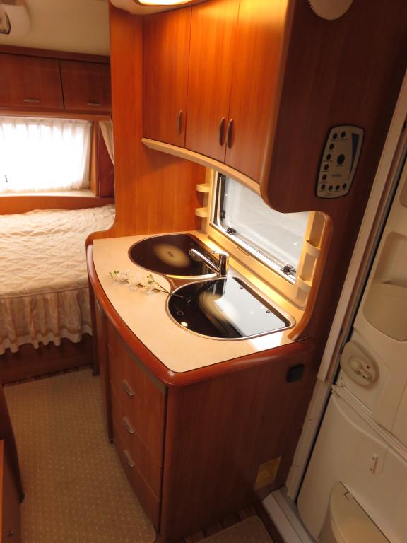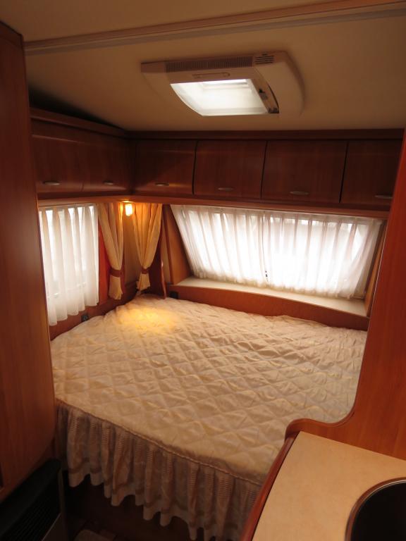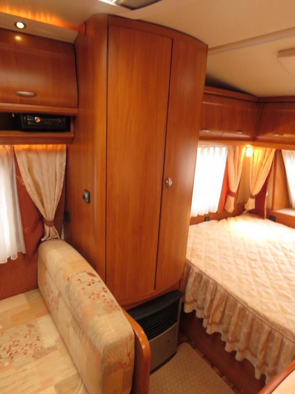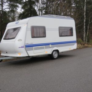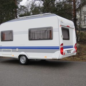 Näppärän kokoinen ja hienossa kunnossa oleva vaunu. Edessä parivuode joustinpatjalla, keskellä keittiö ja takana istuinryhmä josta sijattavissa toinen parivuode. Takakulmassa wc.