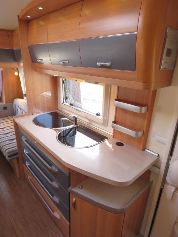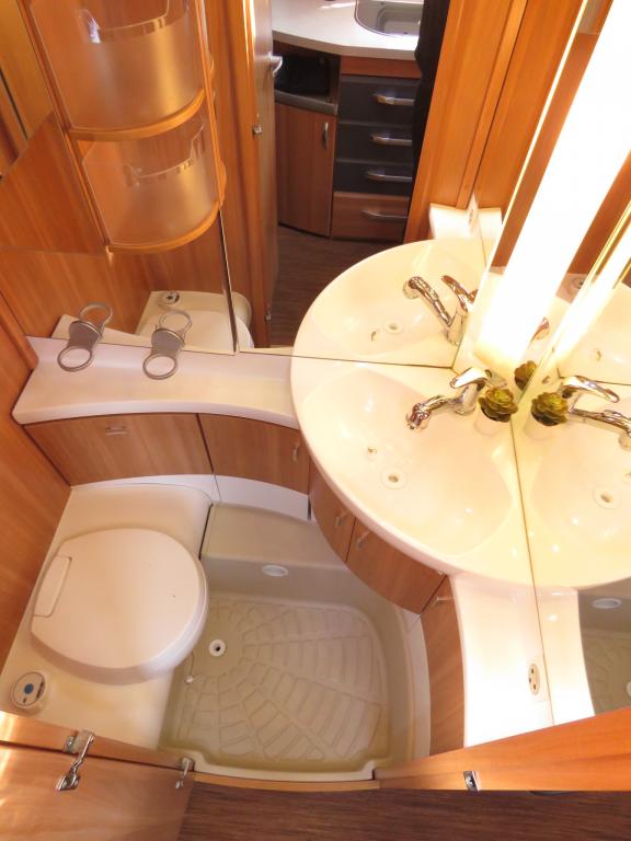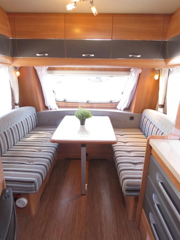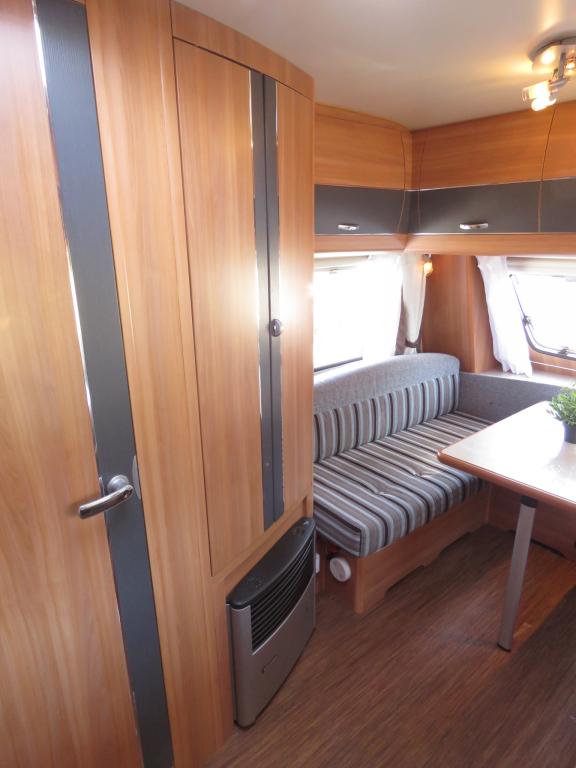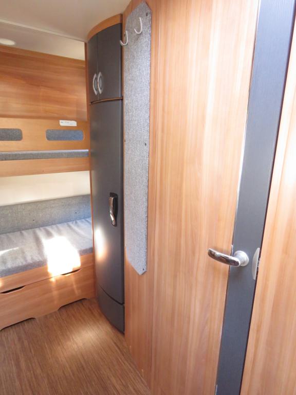 Varusteina mm: Truma- keskuslämmitys sähköpatruunalla, Lattialämmitys, Pussimarkiisi, Korkea jääkaappi- pakastin, TV- antenni,..