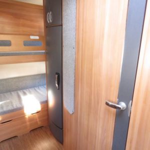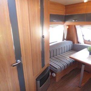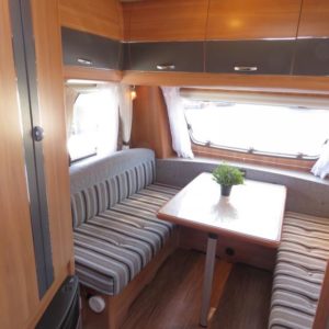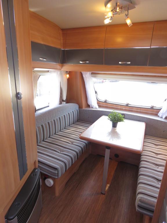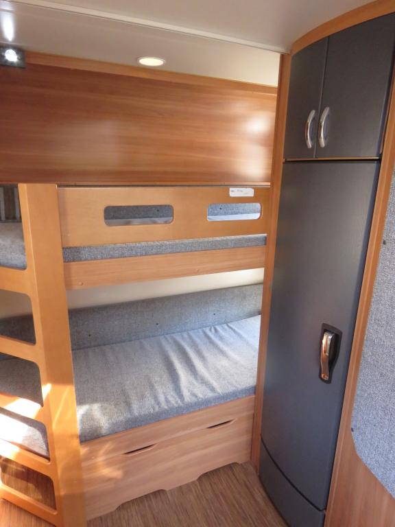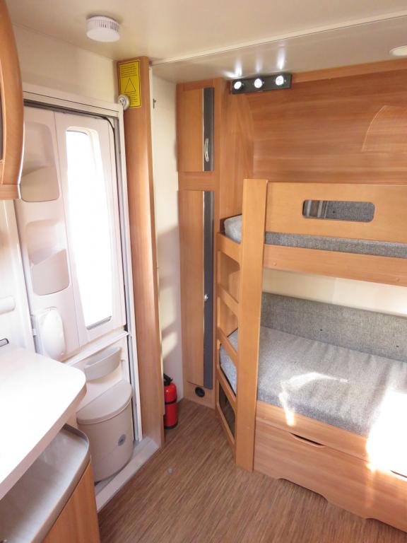 Vaunun takaosassa kerrosvuoteet, edessä valoisa pöytäryhmä joka sijattavissa parivuoteeksi.