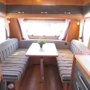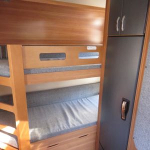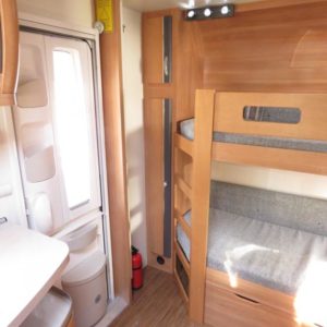 Vaunun takaosassa kerrosvuoteet, edessä valoisa pöytäryhmä joka sijattavissa parivuoteeksi.