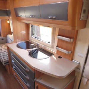 Varusteina mm: Truma- keskuslämmitys sähköpatruunalla, Lattialämmitys, Pussimarkiisi, Korkea jääkaappi- pakastin, TV- antenni,..