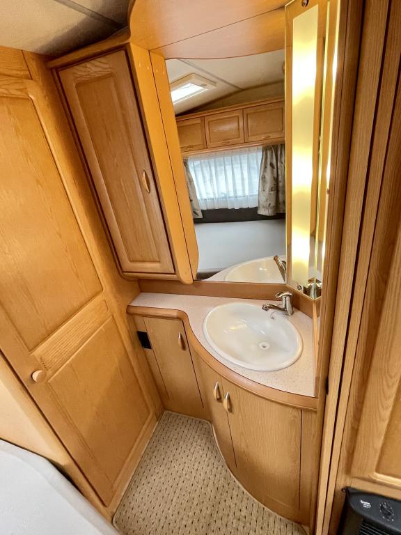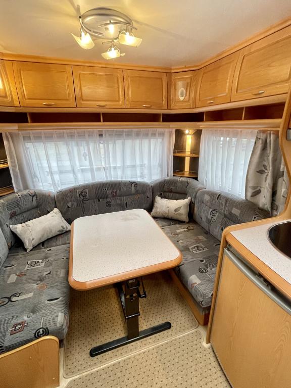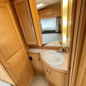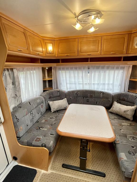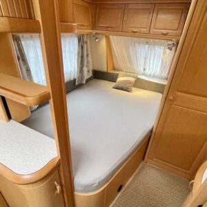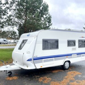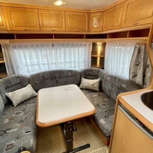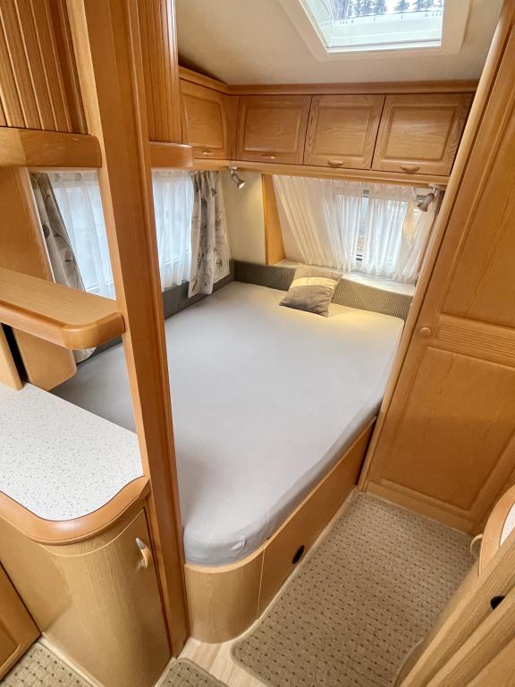 Pohjaratkaisussa edessä pitkittäinen parivuode sekä Wc & Suihkutila. Keskiosassa keittiö sekä kaappitilaa. Takaosassa U- Sohvaryhmä josta pedattavissa lisävuode.