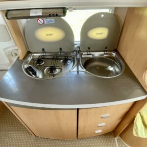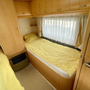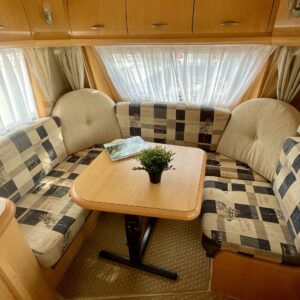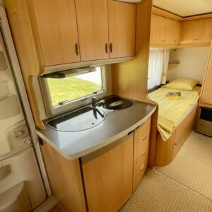 Oikein näpsäkkä (kok.paino 1300kg) hienon kunnon omaava erillisvuoteinen Hobbyn matkailuvaunu. Edessä on molemmilla sivuilla pitkittäis-suuntaiset erillisvuoteet. Vuoteiden alle jää säilytystiloja ja niihin on käynti myös ulkopuolisten luukkujen kautta. Keskelle on sijoitettu keittiö normaalilla matkailuvaunun keittiövarustuksella. Etuosaa hallitsee U-ryhmä, mistä saadaan tarpeen vaatiessa sijattua vuode kahdelle henkilölle. Lämmitysjärjestelmänä on Trumaticin ilmakeskuslämmitys ja sähkövastuksilla (sähköpatruuna) varustettuna. Juuri tarkastettu ja katsastettu vaunu valmiina kohti uusia seikkailuja.
