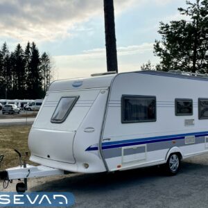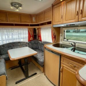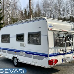 Vaikka vaunulla vuosia jo onkin, niin sisäpuoli on ikäisekseen hienossa kunnossa. Etuosasta löytyy tilava parisänky kaapistoineen. Vieressä wc-tila, josta löytyy suihku. Makuuhuoneen saa eristettyä omaksi tilaksi liukuovella, jos toisella maistuukin unet vähän pidempään. Keittiöstä löytyy kaikki tarvittava kokkailuun, kivasti kaappitilaa ja liesituuletin. Televisiolle tarkoitettu kaappi on iso ja loistava mahdollisuus myös muuksi säilytystilaksi. Pienen projektorin ja valkokankaan asentaminen makuutilaan voisi olla kiva lisä leffailtoja ajatellen. Vaunun takaosassa on iso u-pöytäryhmä, johon mahtuu kuusikin henkilöä syömään. Lämmitimen yläpuolella on vielä oma vaatekaappi. Tästä kiva pienempi Hobby kesänrientoihin.