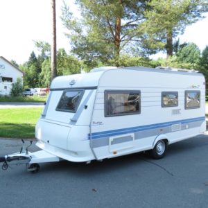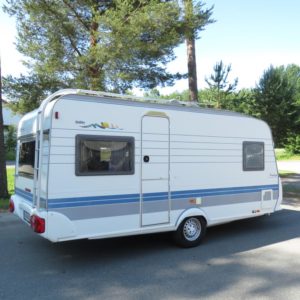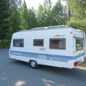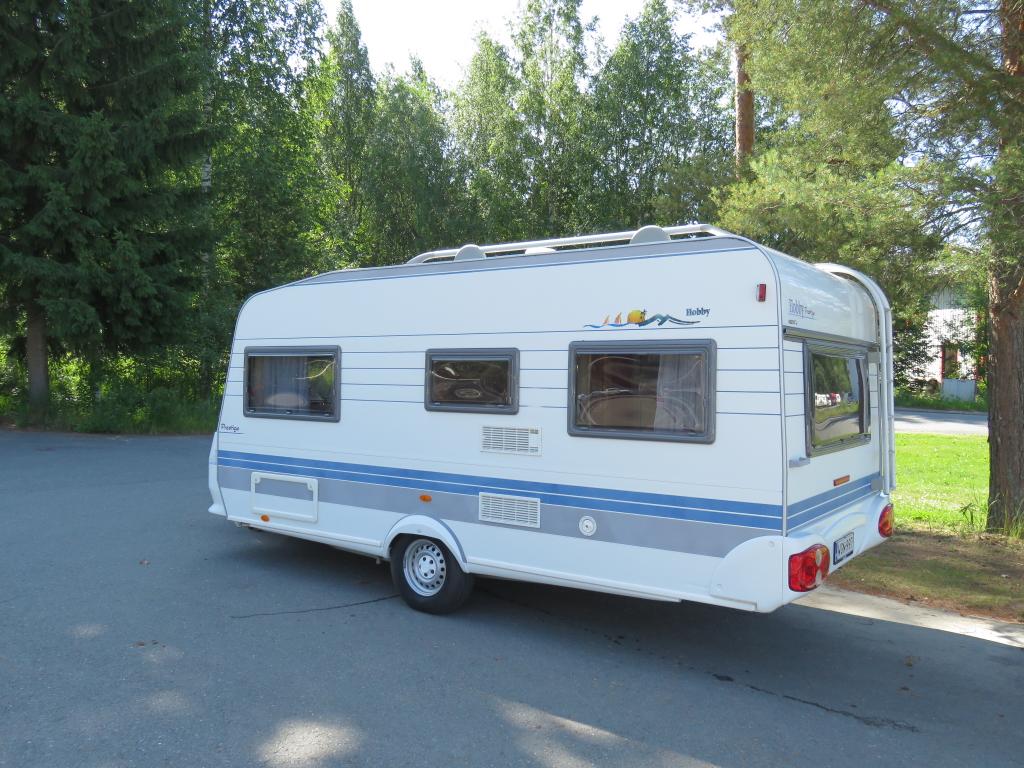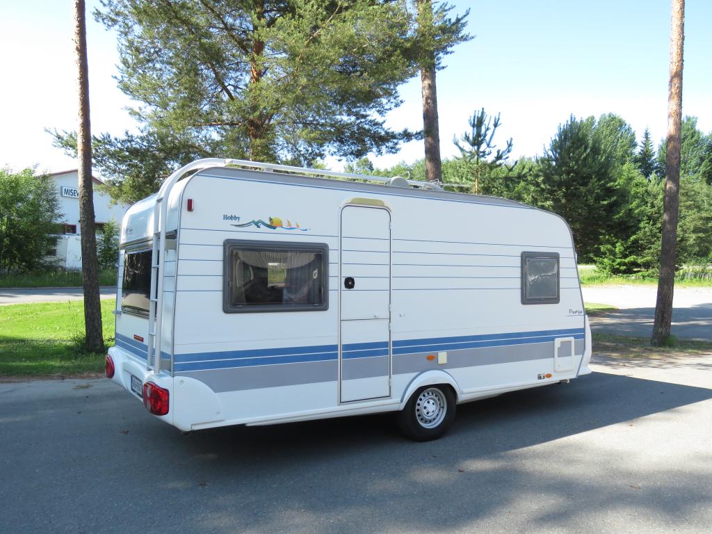 Siistikuntoinen ja viihtyisä Hobby pitkittäisellä parivuoteella. Kevyt vetää, kokonaispaino vain 1 350 kg.