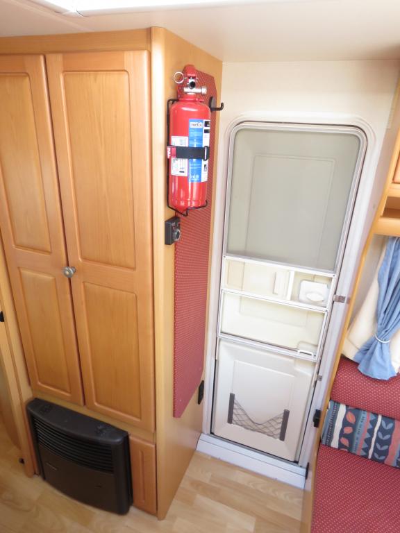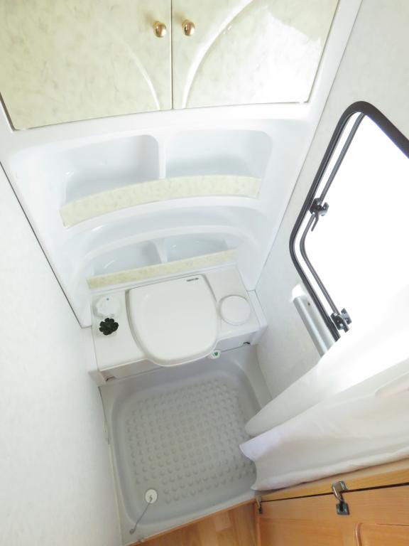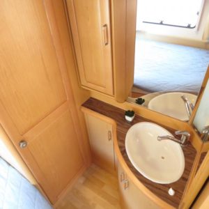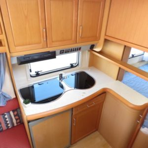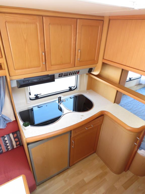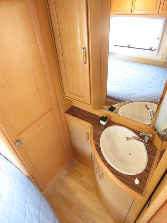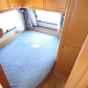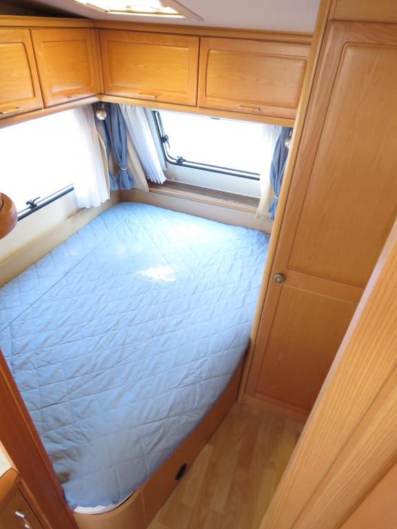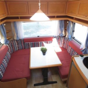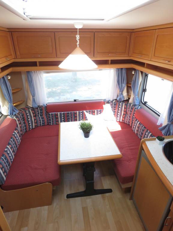 Vaunun etuosassa pitkittäinen parivuode ja pesuhuone, takana valoisa ja viihtyisä U- ryhmä joka sijattavissa toiseksi parivuoteeksi.