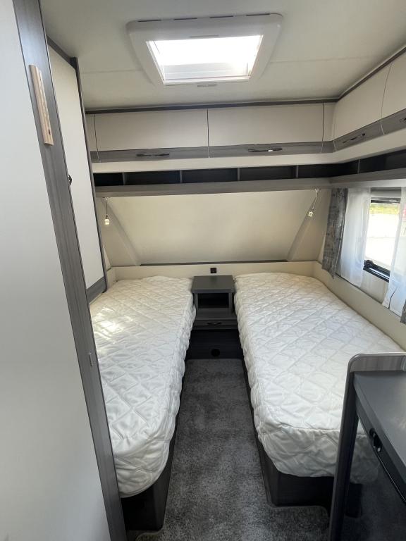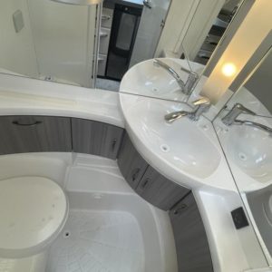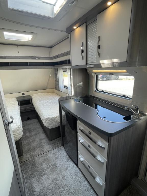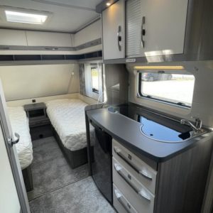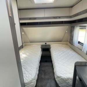 Pohjaratkaisussa takana sohvaryhmä, josta pedattavissa lisävuode. Keskiosassa keittiö sekä Wc & Suihkutila. Etuosassa erillisvuoteet ja mekanismi jolla vuoteista saa rakennettua parivuoteen.