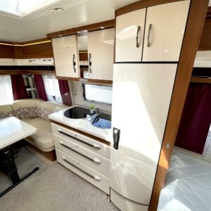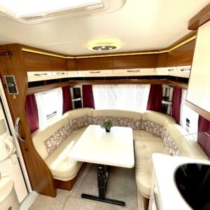 Pohjaratkaisussa takana u- sohvaryhmä. Keskiosassa keittiö sekä kaappitilaa. Takaosassa pitkittäinen parivuode sekä wc-tila.