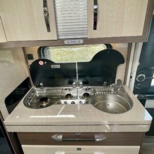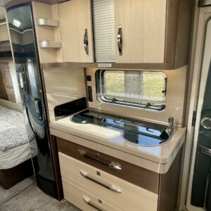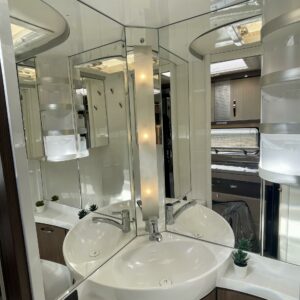 Keskeltä vaunua löytyy pesuhuone/ WC ja keittiösaareke. Keittiön varustukseen kuuluu korkea jääkaappi- pakastin ja liesituuletin.
