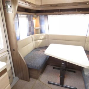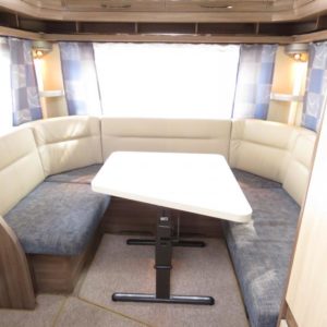 Vaunun etuosassa mukavat erillisvuoteet, takana viihtyisä pöyräryhmä.