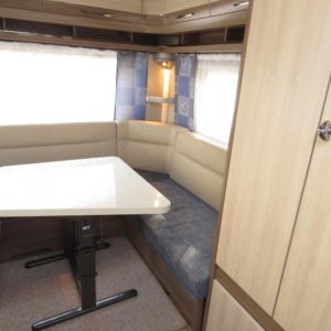 Vaunun etuosassa mukavat erillisvuoteet, takana viihtyisä pöyräryhmä.