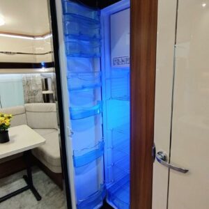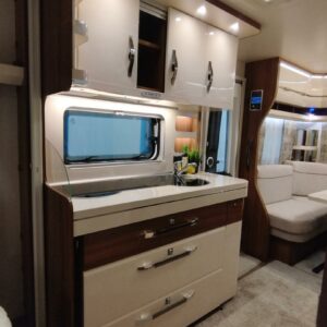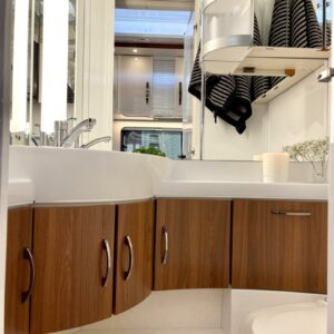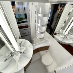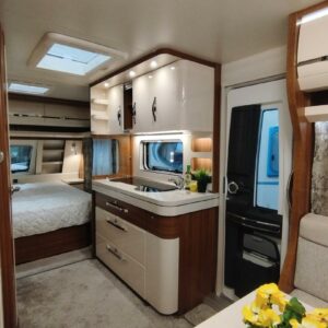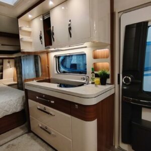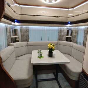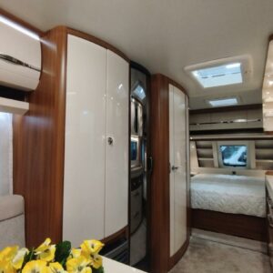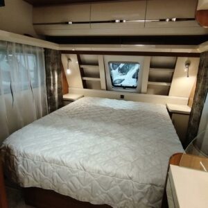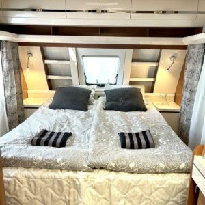 Edessä reilun kokoinen saarekevuodemallinen sänky kahdelle. Keskellä toisella sivulla WC/kylpyhuonetilat ja toisella sivulla tyylikäs keittiö isolla jääkaapilla. Takana U-ryhmä mikä sijattavissa vuoteeksi kahdelle henkilölle.