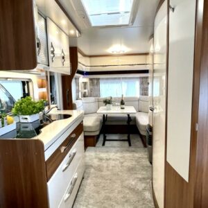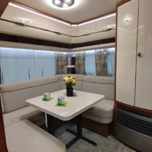 Hieno vaunu halutulla saarekevuoderatkaisulla. Isoon jääkaappiin mahtuu mukavasti evästä ja aurinkopaneelit pitävät akut latingissa. Tällä pääsee lähes uuden vaunun makuun.
